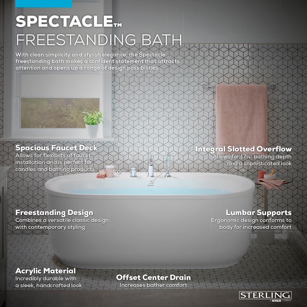 Surround yourself with tranquility and comfort in the Spectacle freestanding bath. Combining luxury with practicality, the oval, ergonomic design conforms to and supports your body as you stretch out and enjoy a deep, relaxing soak. With its gracefully shaped lines and generous bathing depth, this versatile bath complements a wide range of bathroom styles and offers easy installation.