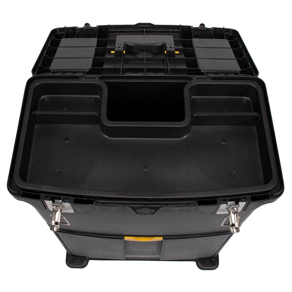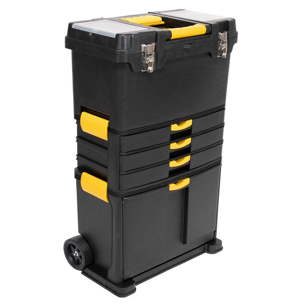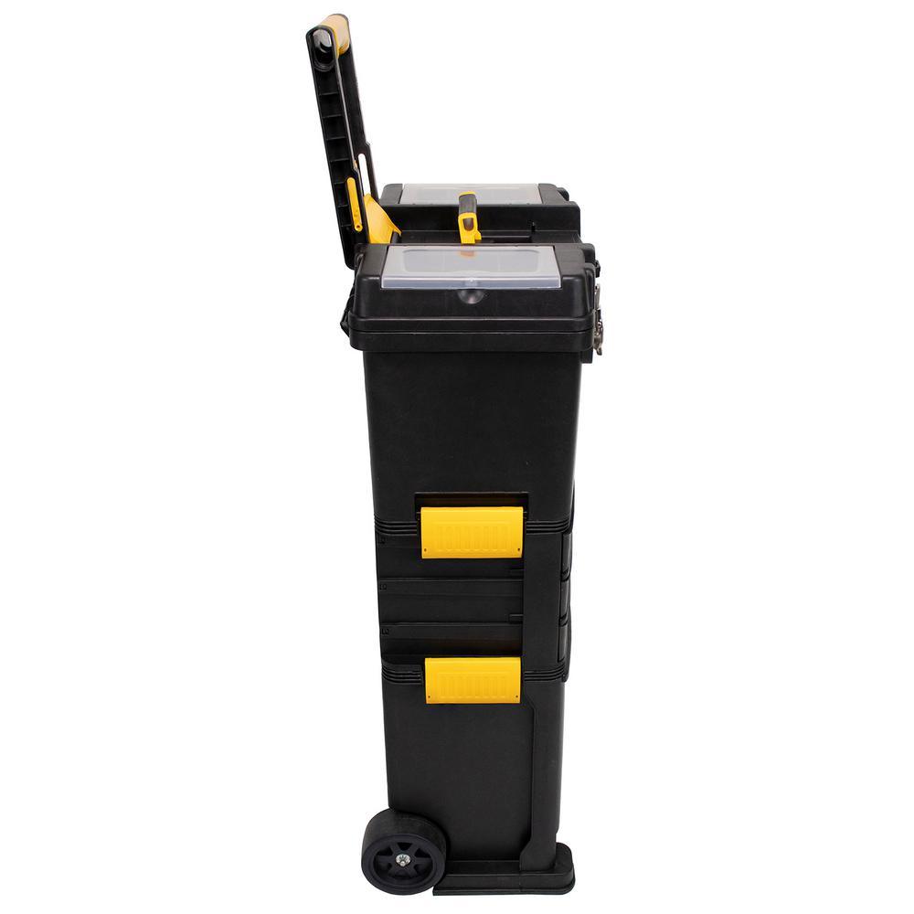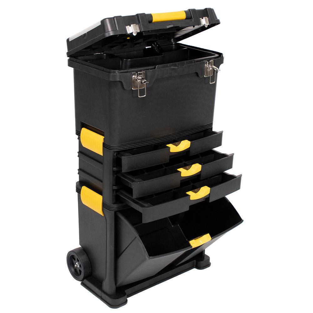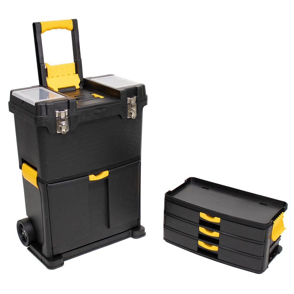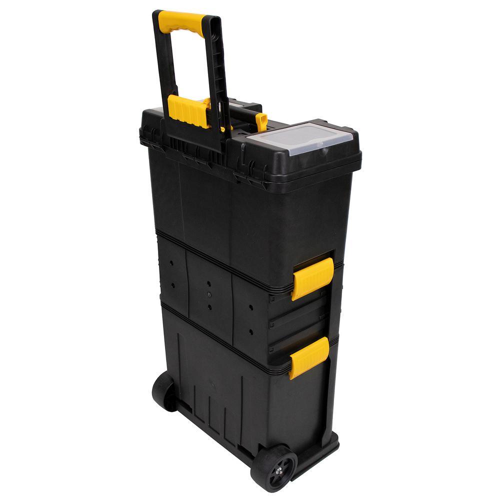Erie Tools Heavy-Duty Portable Toolbox with Foldable Handle and 3 Detachable Storage Compartments keeps your tools organized and easily accessible while on the go. Made of durable polypropylene with stainless steel latches, this rugged toolbox keeps your tools and accessories safe and secure on the toughest job sites. With 3 detachable storage comp1nts you will have room for all of your essential tools and supplies. The Top Tier Toolbox features a comfort grip, foldable, handle and 2 compartments with plastic latching lids for separating nuts and bolts. The inside of the toolbox contains a removable 3 section tray revealing a storage bin 9 in. deep. The Middle Tier is equipped with three 3 pull-out trays, each having eight 8 separate sections, these shelves are perfect for storing your nuts, bolts, and other hardware accessories. The Bottom fold out storage bin is great for taking your power tools or protective equipment with you on the go. It provides plenty of space for anything you decide to bring along to the job site.