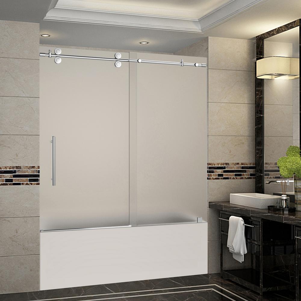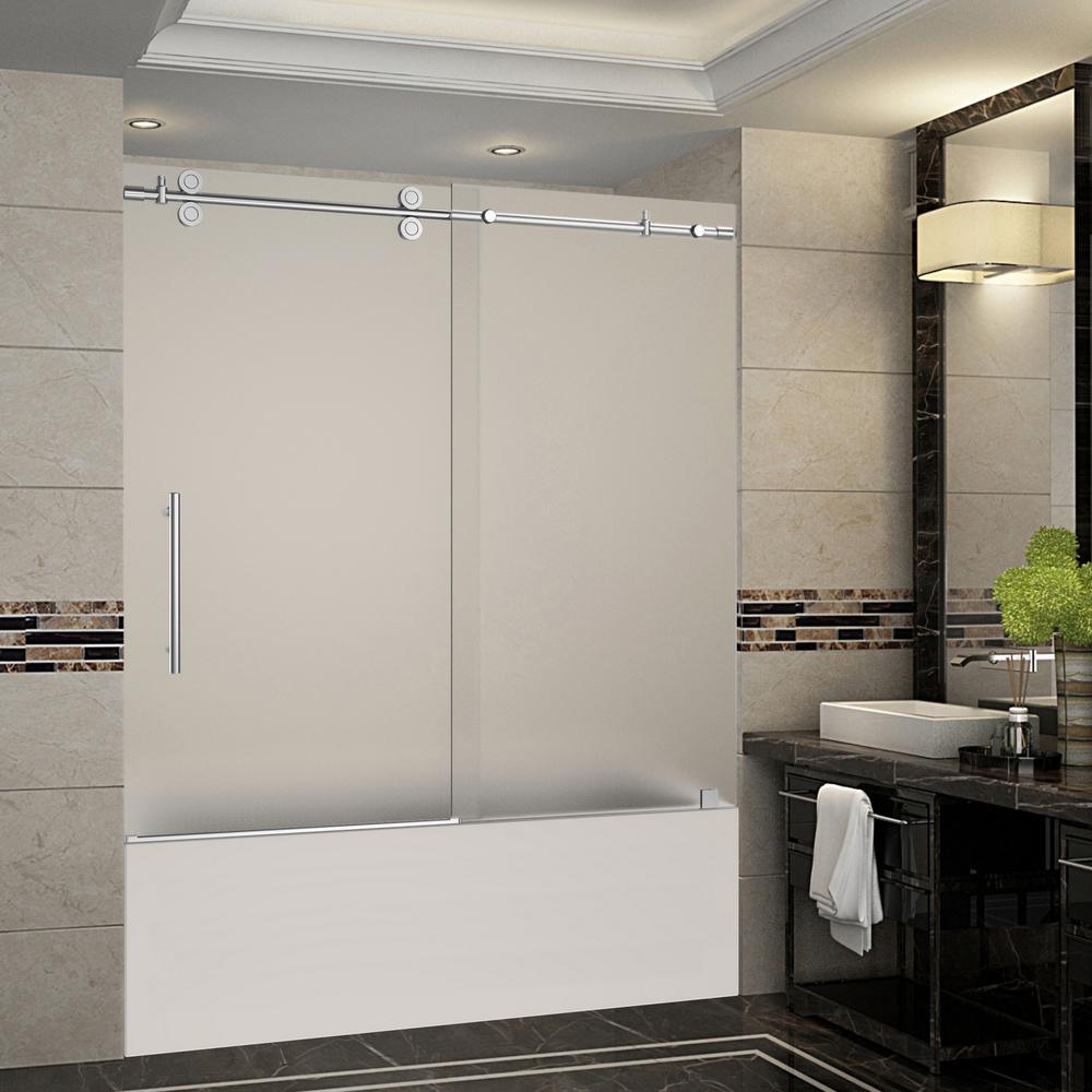 Instantly transform your current bathtub alcove with its old door or curtain with the Langham 60 in. completely frameless sliding tub-height shower door. This luxury fixture is designed with equal parts beauty and functionality. With its smooth, effortless sliding function, this door comes complete with premium frosted 3/8 in. thick tempered safety glass, tested and certified to ANSI Z97.1 Standard, a multitude of hardware finish options and deluxe clear leak-seal strips. This door is engineered for reversible instillation (right or left). Instantly upgrade your bath today with this gorgeous door.