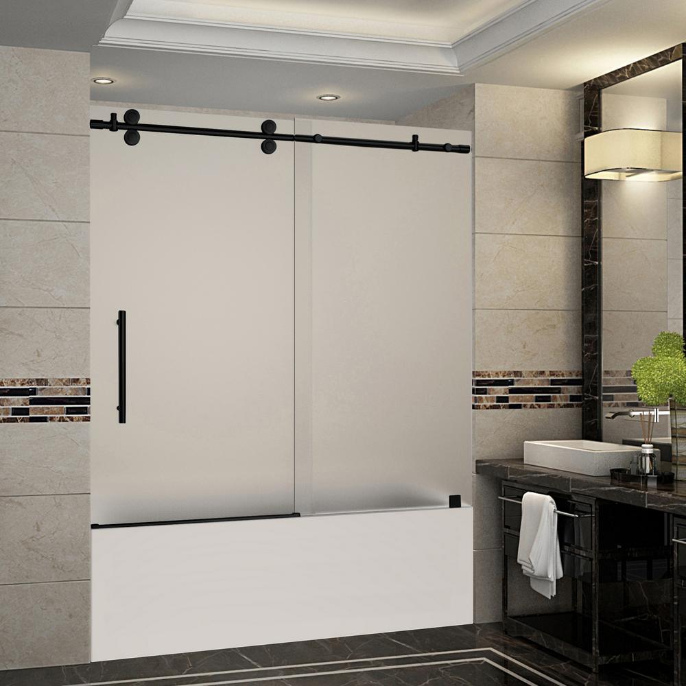 Langham 56 in. to 60 in. x 60 in. Frameless Sliding Tub Door with Frosted Glass in Matte Black