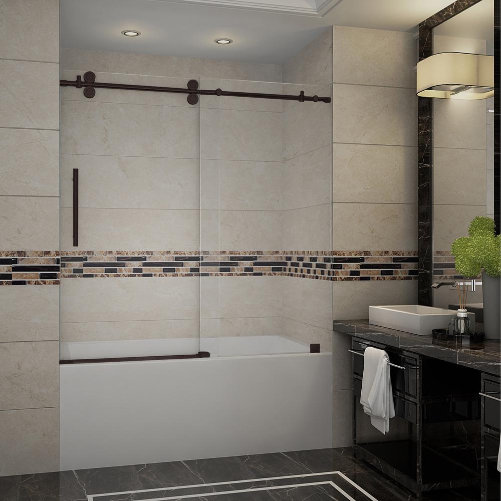 • 56 in. to 60 in. x 60 in. completely frameless sliding alcove tub to height shower door