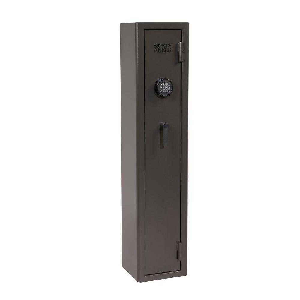 The Sports Afield Home Defense Series SA-HDF 4-Gun Long Gun Safe is the perfect solution for securing your long guns and fortifying your home's defense. A fully programmable electronic lock and matte black drop handle engages five 1 in. locking bolts to grant access to your safe. A fully carpeted interior boasts a steel reinforced top shelf as well as 4 soft-touch overmolded gun racks for a customized storage solution. A uni-Weld body, pry resistant recessed doors, and an Anti-Theft Alert Alarm ensure that your weapons never fall into the wrong hands. Backed by a No Hassel, Lifetime Warranty. California DOJ Approved.