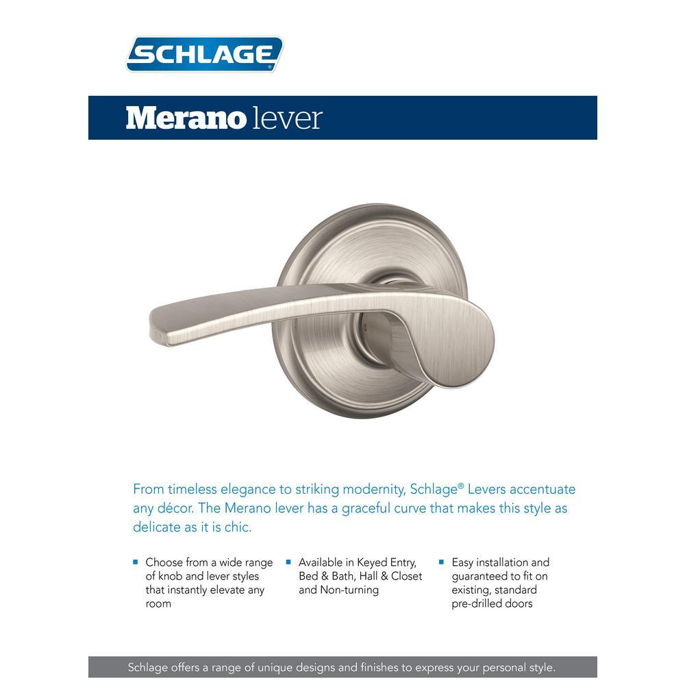 The Schlage Merano Lever with Greenwich Trim Keyed Entry Lock in Matte Black unlocks when the door is opened from the inside, allowing you to leave quickly and conveniently and re-enter easily. The Merano lever has a graceful curve that makes it as delicate as it is chic, while the Greenwich Trims simple and chic look is especially glamorous. The striking appearance of the Matte Black finish creates an elegant look that's sure to be noticed in any style setting. Plus, its been designed and tested with strength and durability in mind.