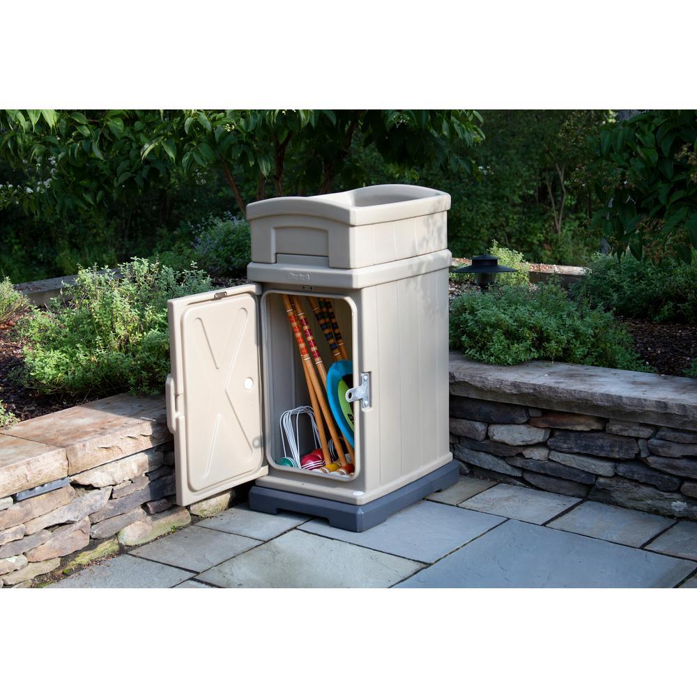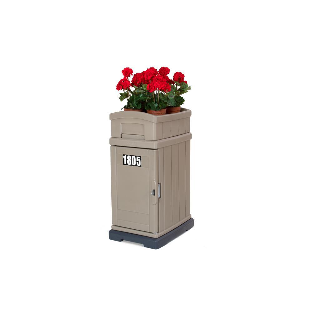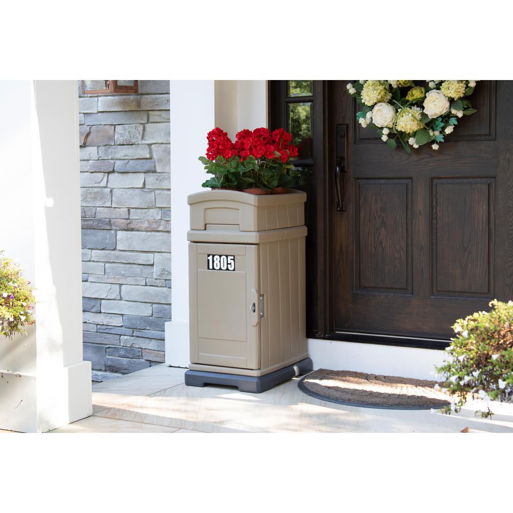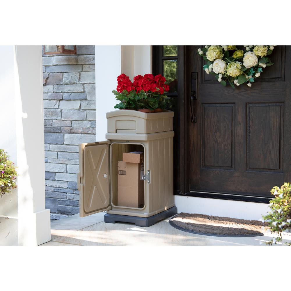 The Hide Away Delivery and Storage Box is a durable, weather resistant home parcel delivery and storage box with classic design that enhances homes while safeguarding and securing large deliveries. The heavy-duty magnetic cabinet door ensures that both ground and express deliveries are shielded from the elements. The top of the box can also be used as a planter for flowers or other items. This all-in-one solution provides protection, storage, and decoration for package deliveries. The box can withstand rain, sleet, snow, and wind, and the magnetic closure of the cabinet door opens to reveal over 5 cubic feet of storage space. The sturdy resin base can be filled with sand or water to prevent movement, even in strong winds. The planter measures 19 inches in length, 13 inches in width, and 4 inches in depth, and adhesive address numbers are included. Minimal assembly is required to set up this versatile delivery and storage box.