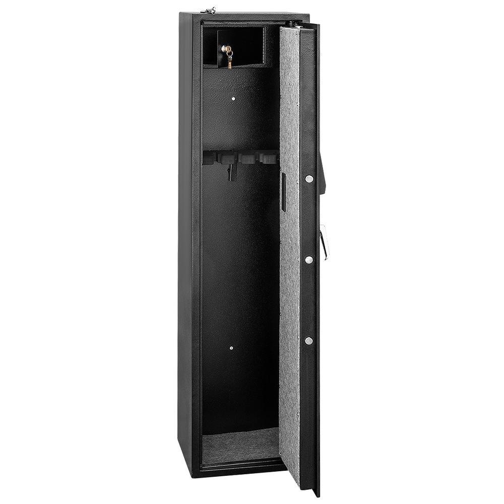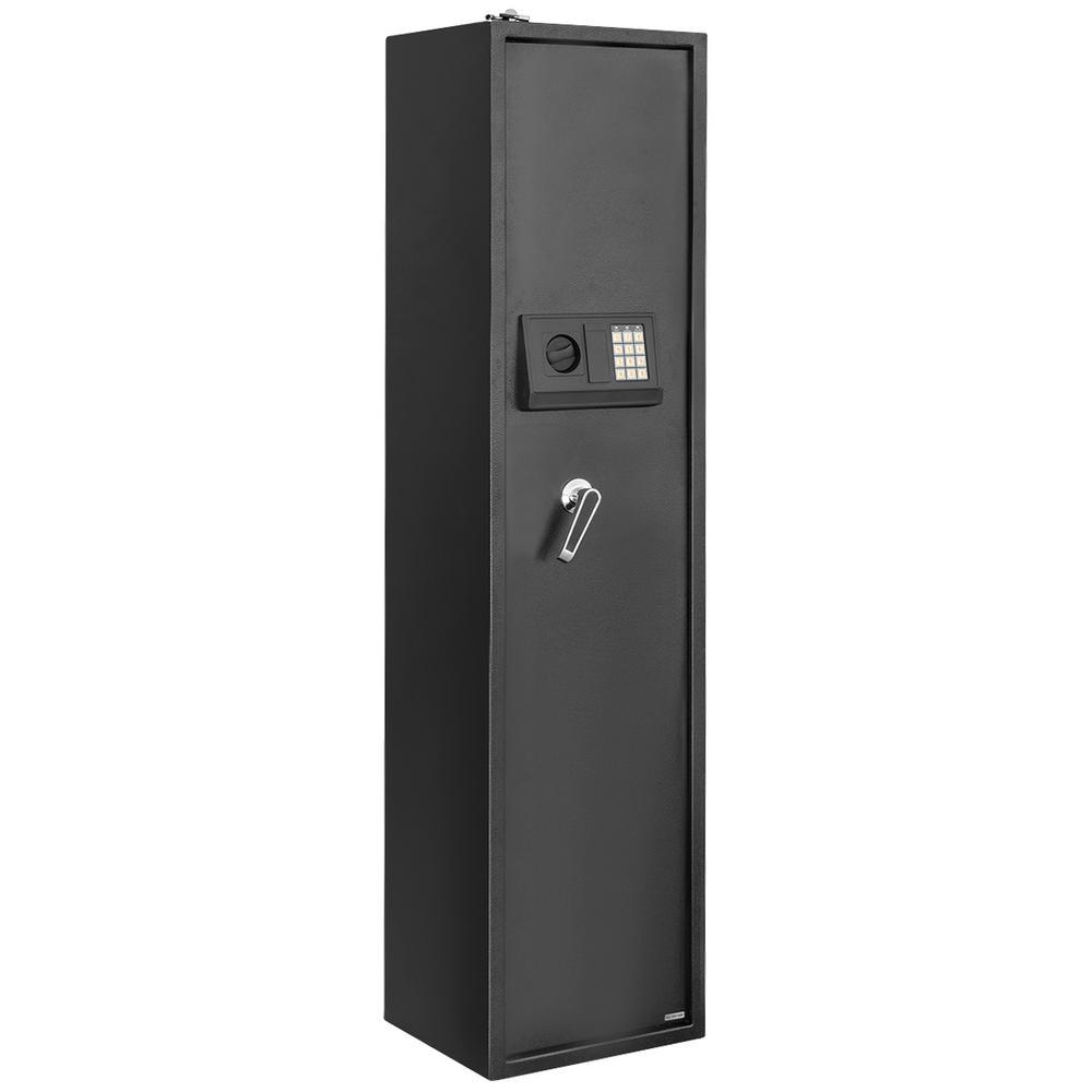 The XtremepowerUS 9-Gun Safe Electronic Lock Security Box keeps your firearm collection, ammunition and other valuables secure from unwelcome guests. This security lockbox features a fully programmable electronic keypad lock made ready-to-use as it arrives fully assembled, simply insert the batteries and set the keypad. It is constructed from sturdy and durable steel construction with powder-coated exterior to prevent rust and corrosion. Accommodates up to 5 long guns and 4 small handguns to keep your collection safe and secure.