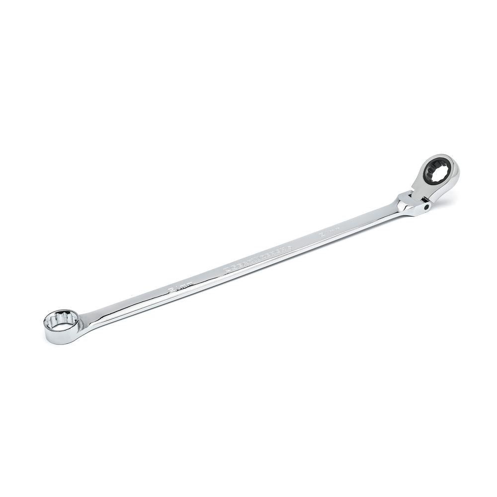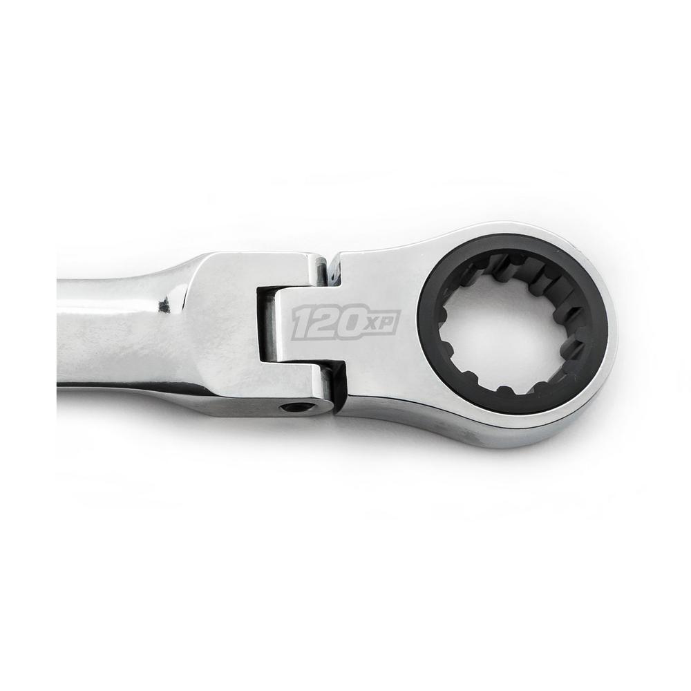 The GearWrench 120XP Flex-Head Gearbox ratcheting wrenches offer the longest reach of any GearWrench ratcheting wrench. The combination of the 120 position ratcheting wrench mechanism with 3 swing arc, the flex-head and XL beam length give the best access and leverage available. Universal spline drive works on 5 different common fasteners, 12 point and 6 point, rounded 6 point, spline, E-Torx and square. Non ratcheting end for breaking free fasteners and 0 offset to increase access.