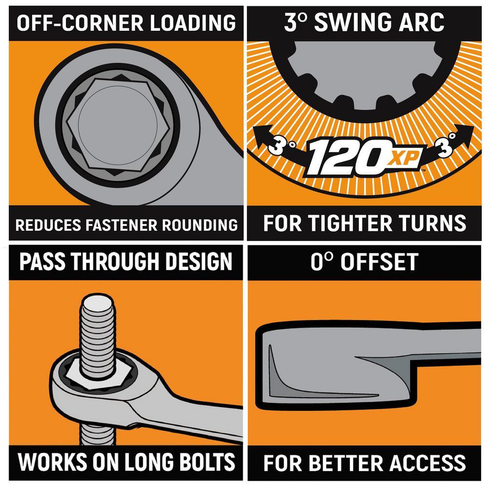 • 120XP ratcheting box ends have 120 positions providing a 3 swing arc so you can turn fasteners in tighter confines