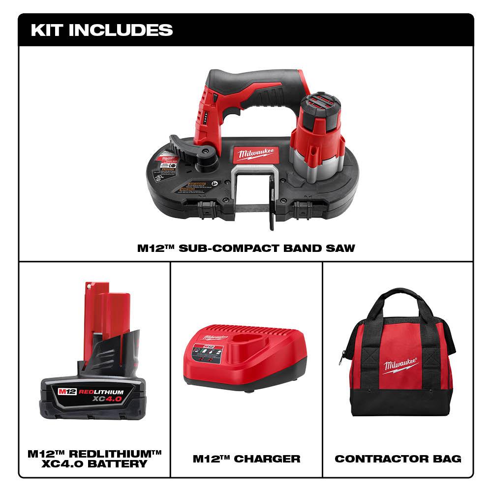 Compact, lightweight and powerful, the Milwaukee M12 12-Volt Lithium-Ion Cordless Sub-Compact Band Saw cuts through small diameter materials with ease. Ideal for overhead cutting applications, this powerful saw can cut through 3/4 in. EMT in only 3-seconds and gets over 150 cuts per charge with the M12 REDLITHIUM XC high capacity battery. Featuring a 1-5/8 in. x 1-5/8 in. cut capacity and low vibration, this saw also features a dual-latching lower guard that covers the blade outside the active cutting area, addressing OSHA guarding requirements and making this tool suitable for 1-handed use. M12 REDLITHIUM XC extended-capacity battery delivers 4 Ah (48-Watt hour) of run time-even in sub-zero temperatures. Each 12-Volt lithium-ion battery is laden with new-age REDLINK circuitry engineered to prevent overloads and protect against cell-damaging discharge.