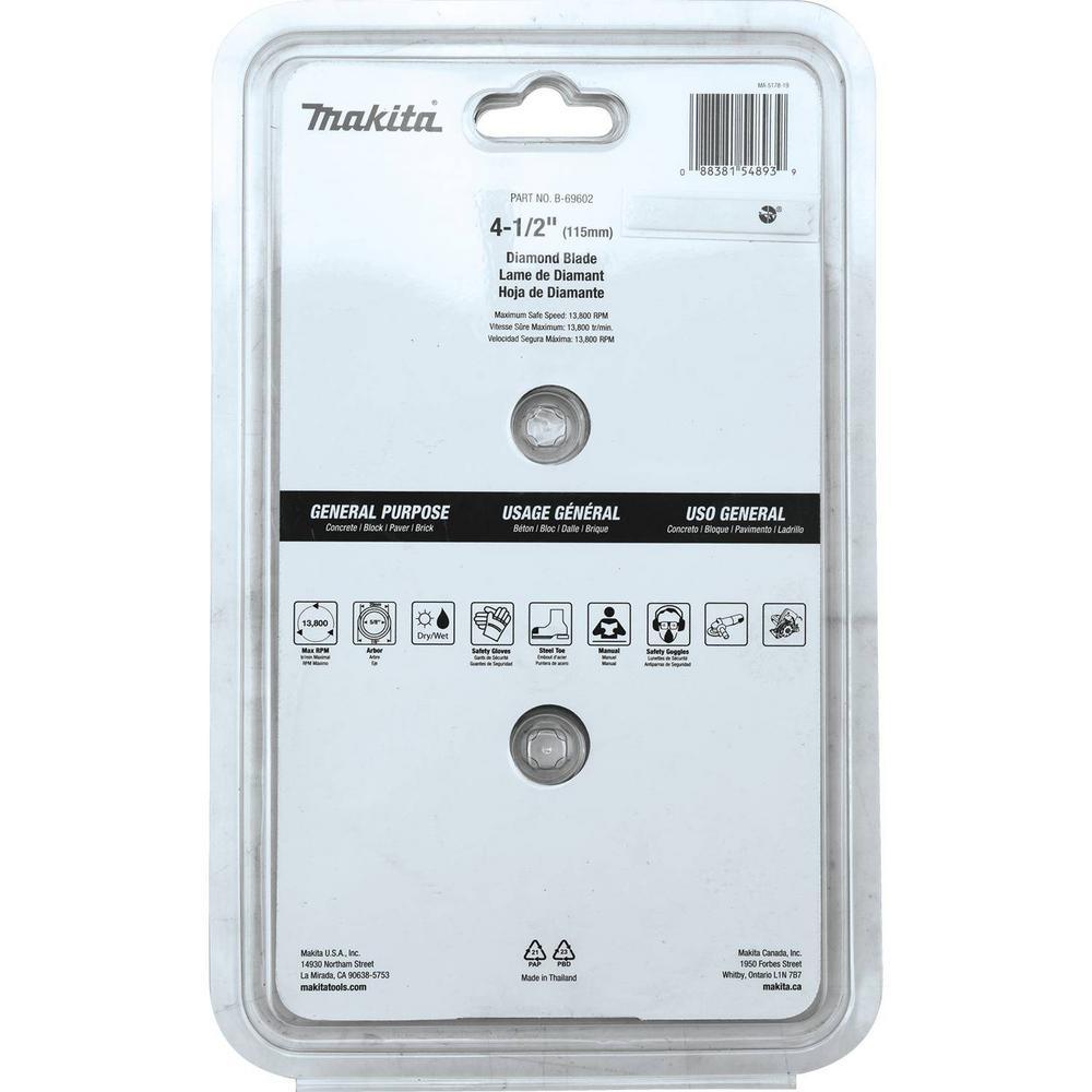 The Makita 4-1/2 in. Segmented Rim Diamond Blade is ideal for general purpose cutting applications including block, brick and cured concrete. The segmented slots are engineered to deliver a faster yet cooler cut. Diamond blades are part of Makita's growing line-up of solutions for concrete applications.