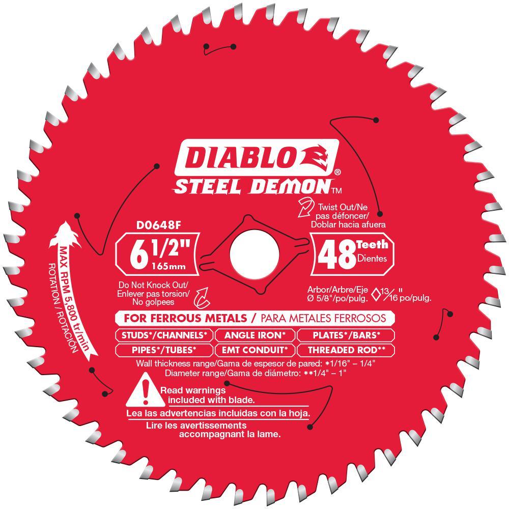 Made of tungsten-titanium carbide, the Diablo 7-1/4 in. x 48-Tooth Steel Demon Ferrous Metal Cutting Saw Blade was designed to withstand the impact of cutting through metal to give you a long-lasting solution. It has a Triple Chip cutting grind to maximize speed and durability. This blade was designed to fit all 5/8 in. bores.