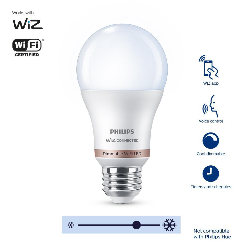 Philips Smart Wi-Fi LED lighting puts you in complete control of your lighting with smart bulbs that are easy to use, functional, and affordable. We’ve made all your favorite high-quality Philips bulbs smarter, just connect them to your existing Wi-Fi network. Smart Dimming Daylight – brighten up your home with a cool energizing daylight color. Control your lights wherever you are using the WiZ app or your favorite compatible voice control device. Product requires a Wi-Fi connection to operate wirelessly. Compatible with WiZ apps and products along with Google Assistant, Amazon Alexa, and Siri Shortcuts.