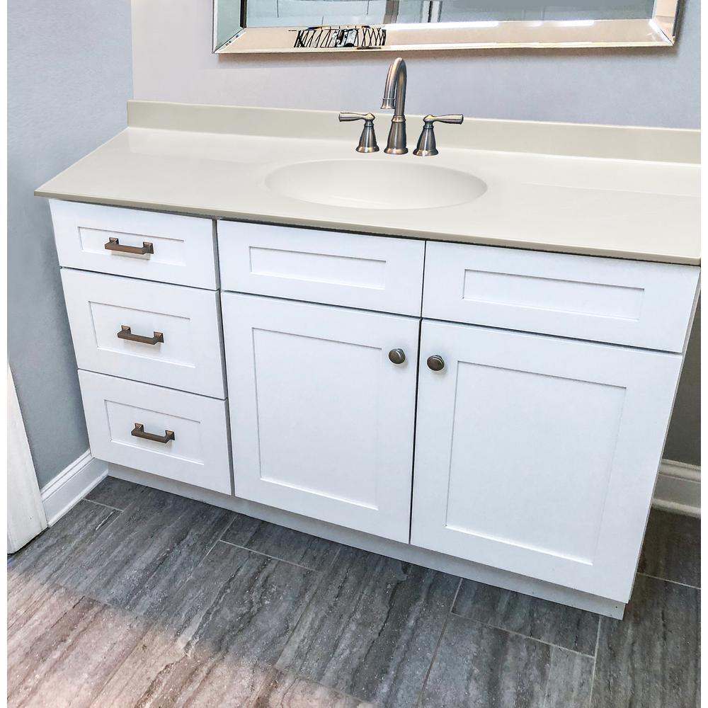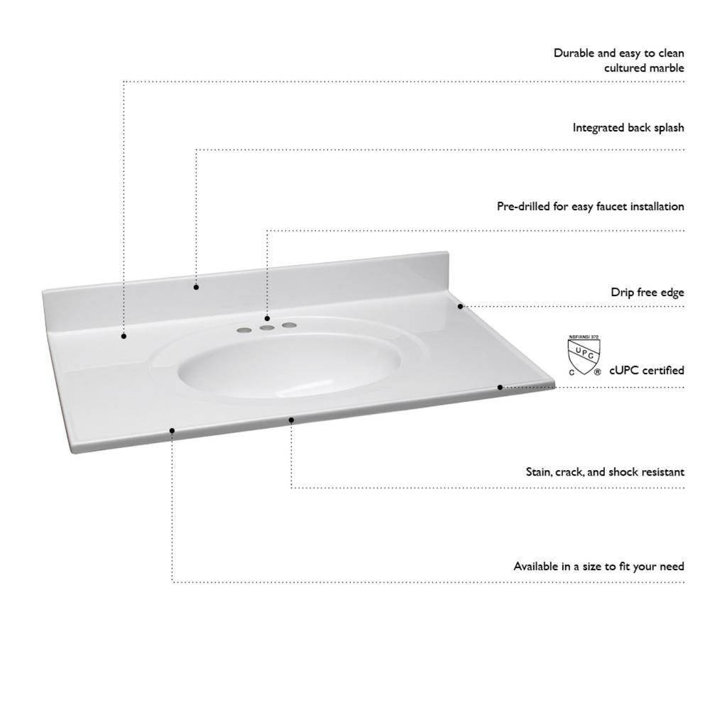 Give your bathroom that clean, classic look you’ve been searching for with the Design House 49 in. Cultured Marble Vanity Top with white on white finish. This spacious top features a drip free edge to help contain excess water and squared edges that evoke a more modern look. Three pre-drilled holes make installing a 4 in. centerset faucet easy and an integrated backsplash creates a barrier between your wall and the vanity to help prevent mold and water damage. The oval bowl at the heart of this top is integrated directly into the design for a seamless look. The Cultured Marble Vanity Top comes with a 5-year limited warranty that protects against defects in materials and workmanship.