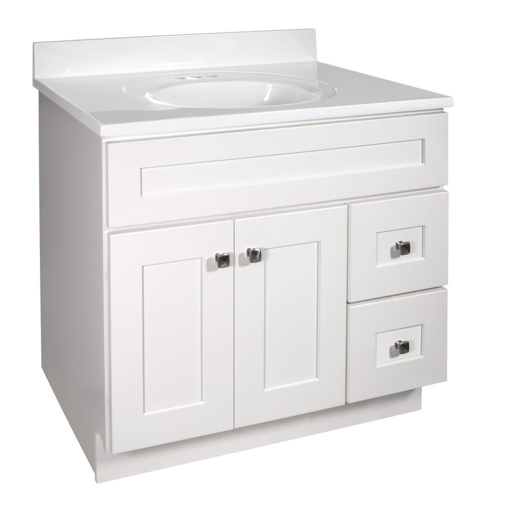 Give your bathroom that clean, classic look you’ve been searching for with the Design House 37 in. Cultured Marble Vanity Top with solid white finish. This spacious top features a drip free edge to help contain excess water and squared edges that evoke a more modern look. Three pre-drilled holes make installing a 4 in. centerset faucet easy and an integrated backsplash creates a barrier between your wall and the vanity to help prevent mold and water damage. The oval bowl at the heart of this top is integrated directly into the design for a seamless look. The Cultured Marble Vanity Top comes with a 5-year limited warranty that protects against defects in materials and workmanship.