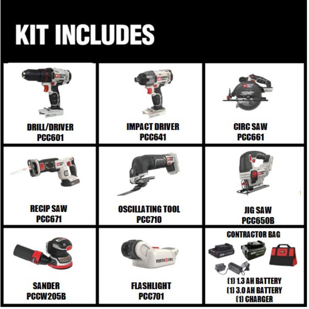 - Includes drill, oscillating tool, circular saw, reciprocating saw, impact driver, work light, jig saw and sander