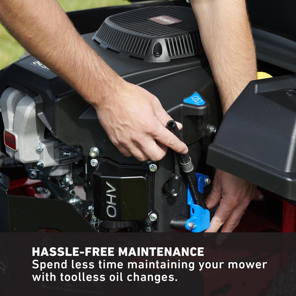 - Hassle-free maintenance. spend less time maintaining your mower with toolless oil change and filter simply flip open the air filter to replace it and the easy removal of the oil drain tube allows for fast drainage and refilling