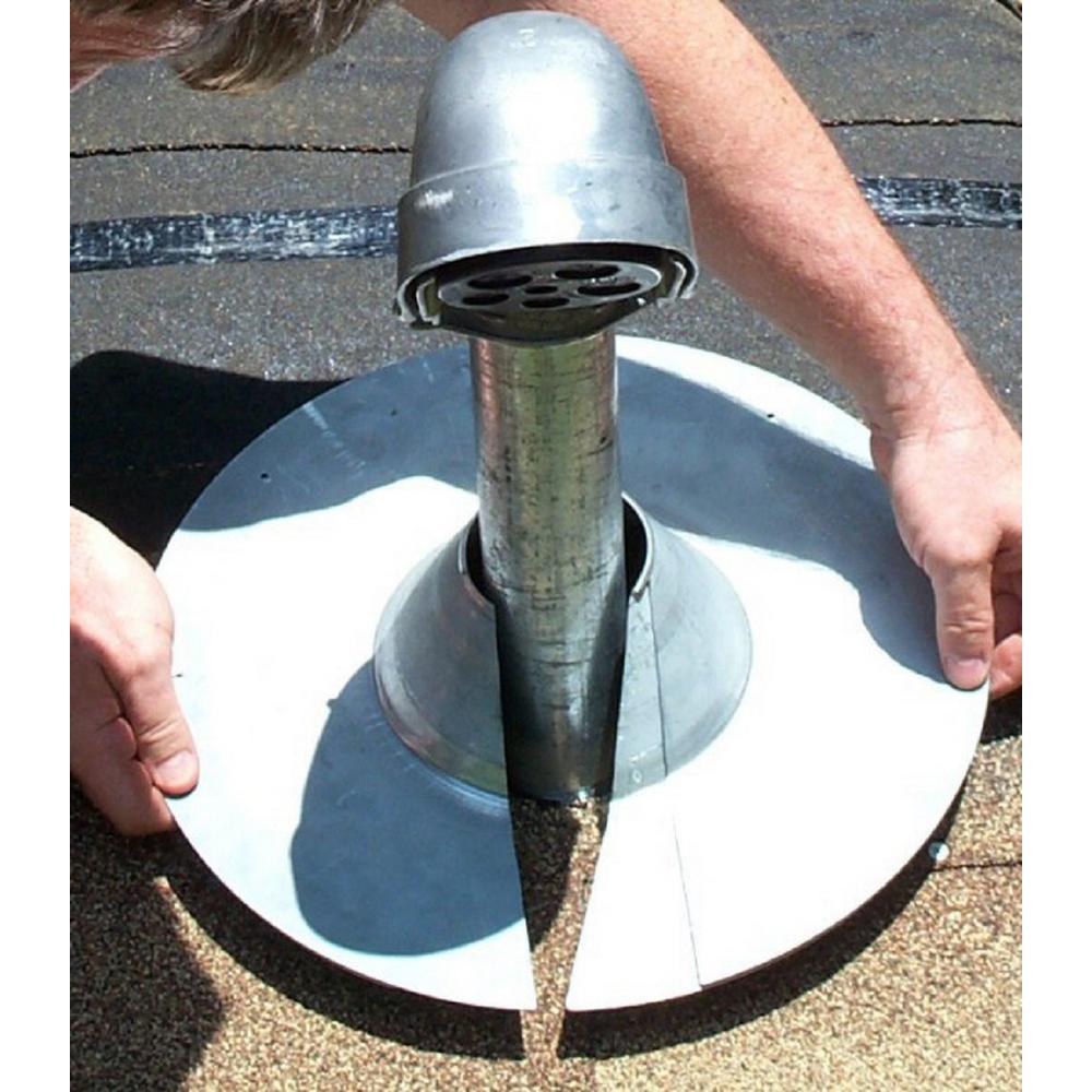 Electric Service Mast Retro-Spin flashing replacement kits include one Retro-Spin galvanized Roof Flashing and one small Retro-Split EPDM rubber storm collar umbrella flashing which has been molded for an exact to match and fit around round or geometric shaped structural penetrations. Each Retro-Spin Flashing kit easily replaces sun damaged, worn out or aging mast flashings eliminating the need to cut the power to a home or buisness. Worn out Expandable rubber flashings that are torn, cut and broken are now easy to replace during re-roof or as an easy DYI repair project. Just order the correct kit that matches the pipe diameter of the electric service mast passing through the roof and put the kit into place using a hammer, nails and a screw driver. Spin Flashings kits Retro install from the side and save money compared to hiring the city or an electrician to cut power in order to slide on a roof flashing over the top. Retro-Spin rotate closed around conduit steel, steel support, Stainless, PVC, ABS, Iron Pipe and many other geometries. Unequivocally, the easiest to install, and best looking retro-fit flashing replacement on the market. Do-It-Yourselfers and Pros who have pride in their work always use the best; A Retro-Sin Flashing Kit. The combination of one Retro-Spin galvanized steel roof flashings plus one Retro-Split EPDM rubber Storm Collar.