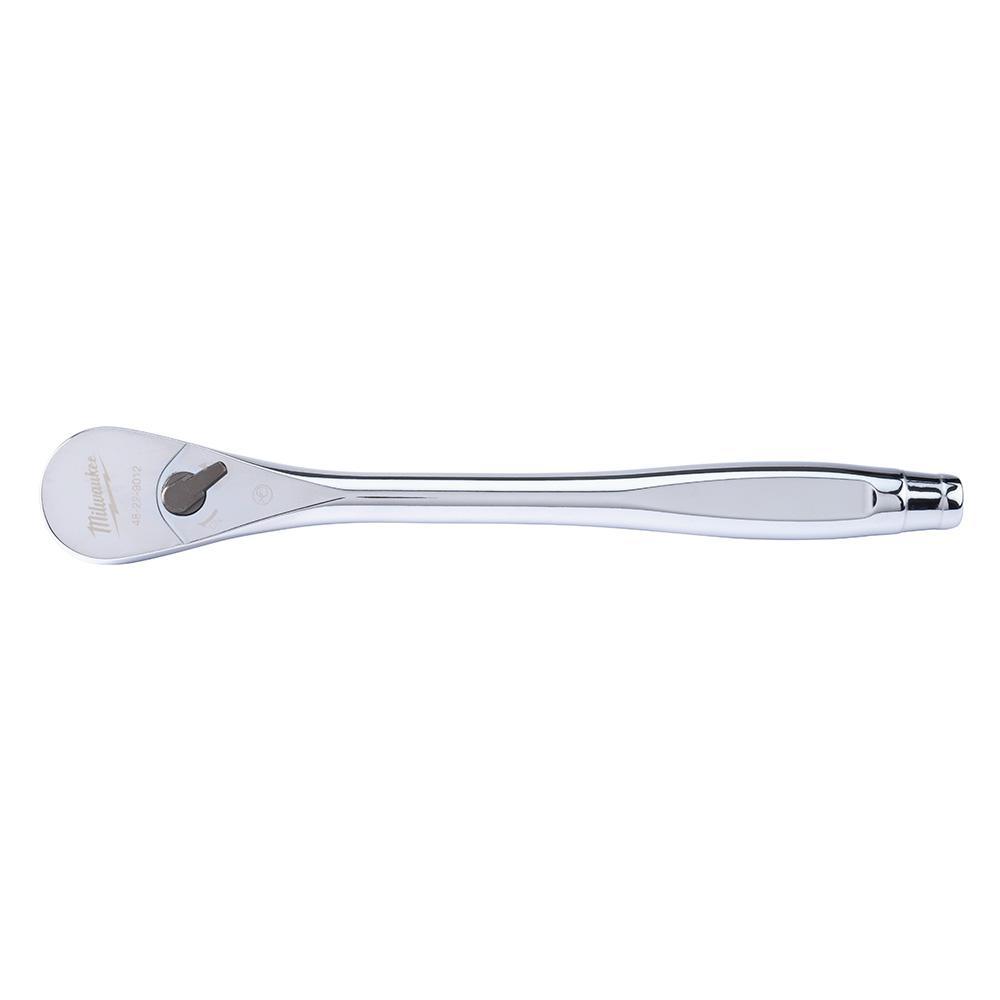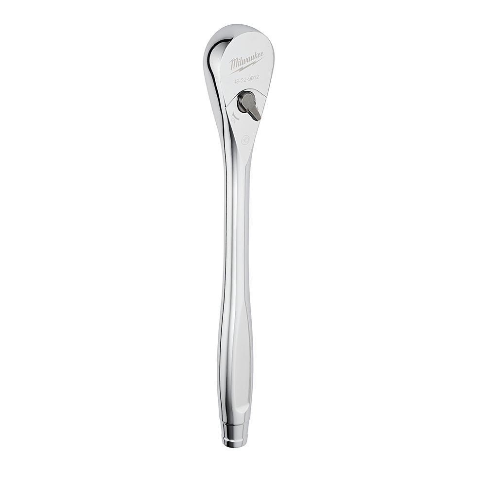 The Milwaukee 1/2 in. Drive Ratchet offers you just 4° of arc swing, allowing access to work in tighter spaces. The drive ratchet features a slim profile design and flush directional lever for better accessibility. The 90° tooth ratchet delivers greater fastener access and an increase in strength during heavy-duty applications thanks to its durable construction. The all-chrome finish provides the ratchet with easy-cleaning and a professional look. The 1/2 in. ratchet is backed by a lifetime guarantee.