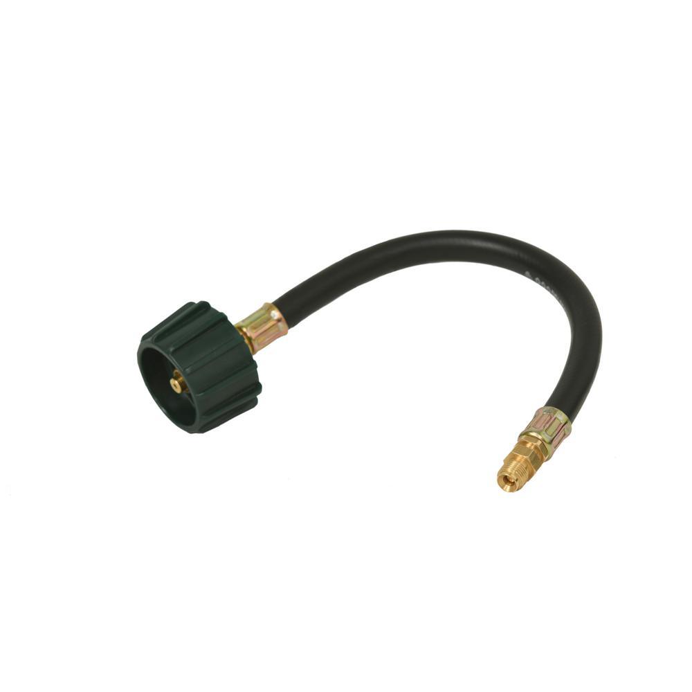Flame King's 12 in. Pigtail Propane Hose Connector is designed to connect a propane cylinder to an RV or trailer propane regulator. It has a Type 1 ACME nut x 1/4 in. inverted male flare. It is rated for 200,000 BTUs per hour. Safety features include thermal protection in case of fire and excess flow protection in case of broken gas line. You can use the pigtail hose with a 20 lbs. or 30 lbs. refillable propane tank and connect it to a regulator or 4-Port Brass Tee. It can also be used to connect to an installed 4-Port Tee as an auxiliary propane supply.