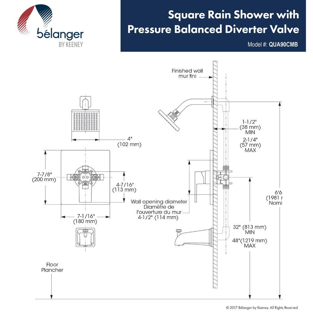The Quadrato Bathtub/Shower Kit provides affordable luxury with a sleek, modern design and long-lasting durability. Featuring a stylish square showerhead and matching tub spout, the QUA90 is of Grade A brass construction and has a ceramic cartridge for maintenance-free use. Its TempRIGHT temperature limiting device prevents water from becoming too hot while soft, silicone nozzles allow you to easily wipe away build-up from hard water and limescale. The kit includes a pressure balanced diverter valve, swivel shower head, bathtub spout, shower arm, and flange, as well as all trim and valve components needed for installation. You can install with confidence knowing Belanger by Keeney products are backed by a Limited Lifetime Warranty.