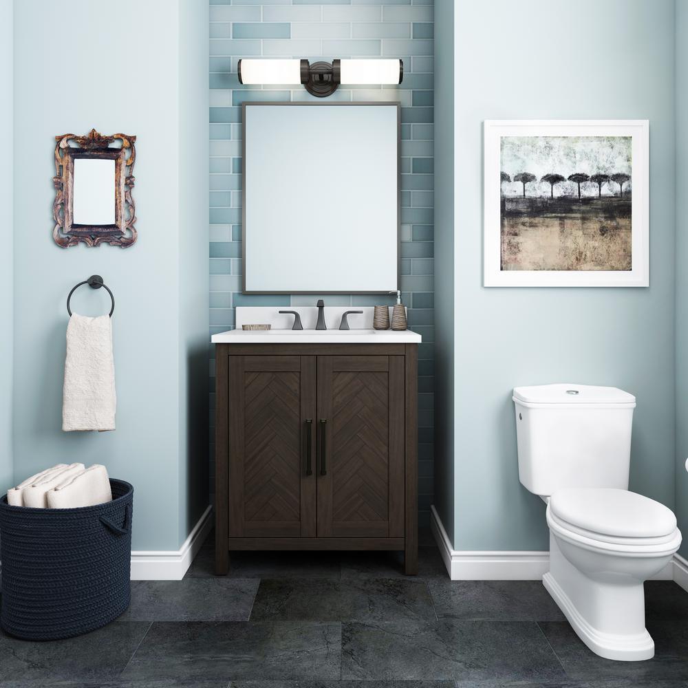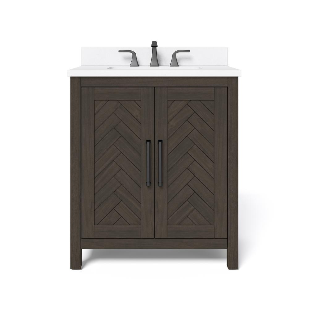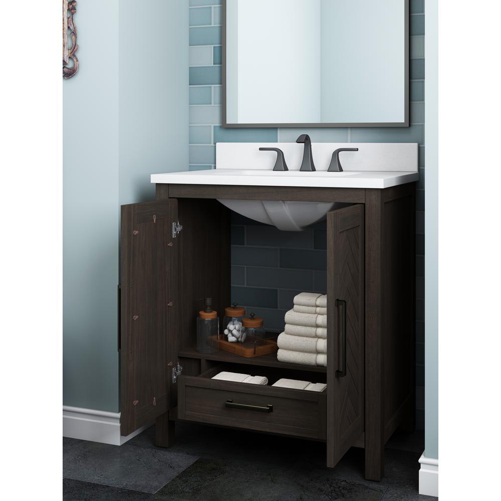 Update your bath or powder room with the Collection Name 30 in. vanity. This vanity has a rich espresso finish and stylish chevron pattern doors. The 30 in. x 20 in. white cultured stone top features an under-counter rectangular basin and 4 in. backsplash. The two cabinet doors are equipped with euro-style soft-close hinges and the cabinet has a concealed pullout drawer, ideal for towels and washcloths. Add enduring style to your bathroom with this Collection Name vanity.