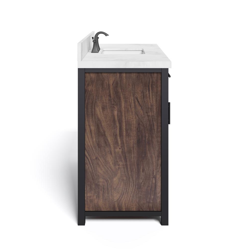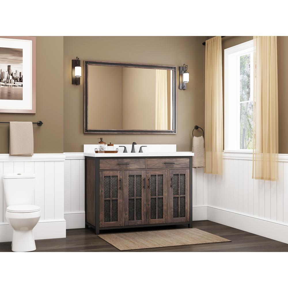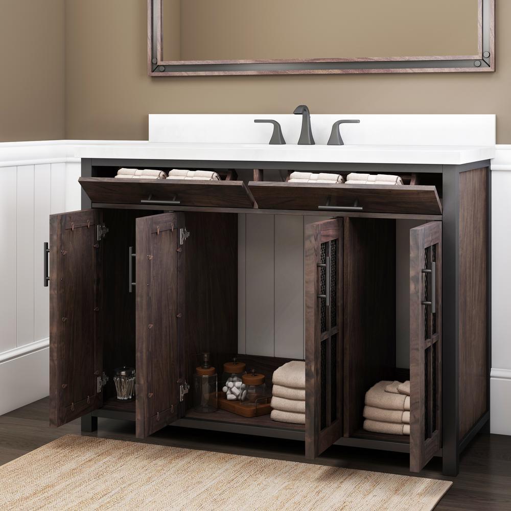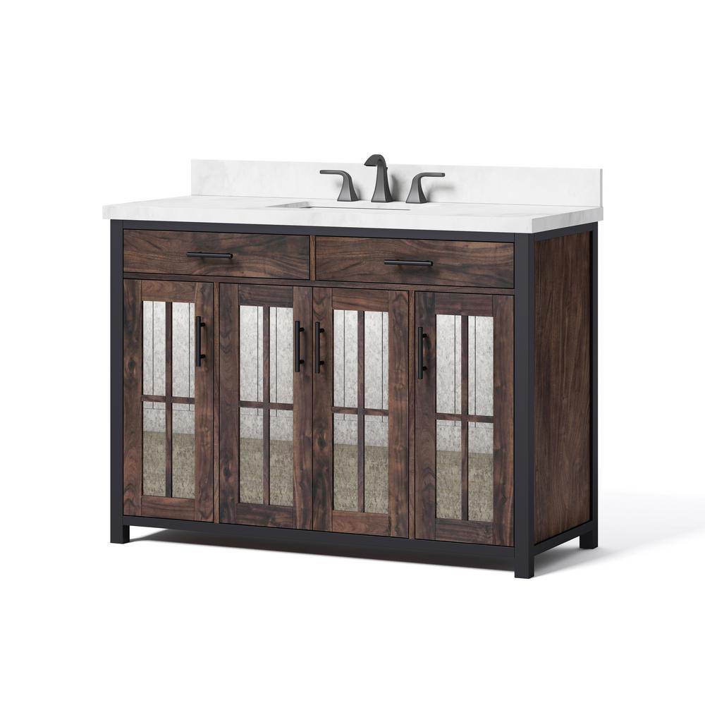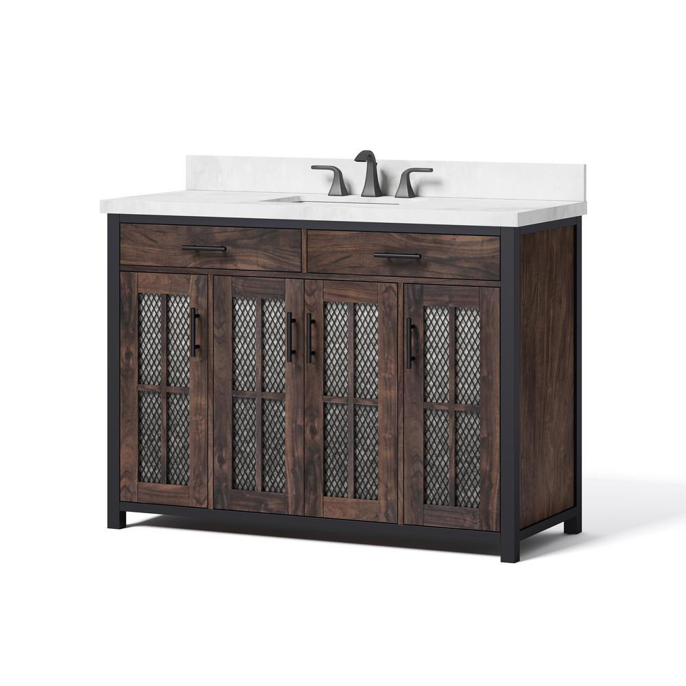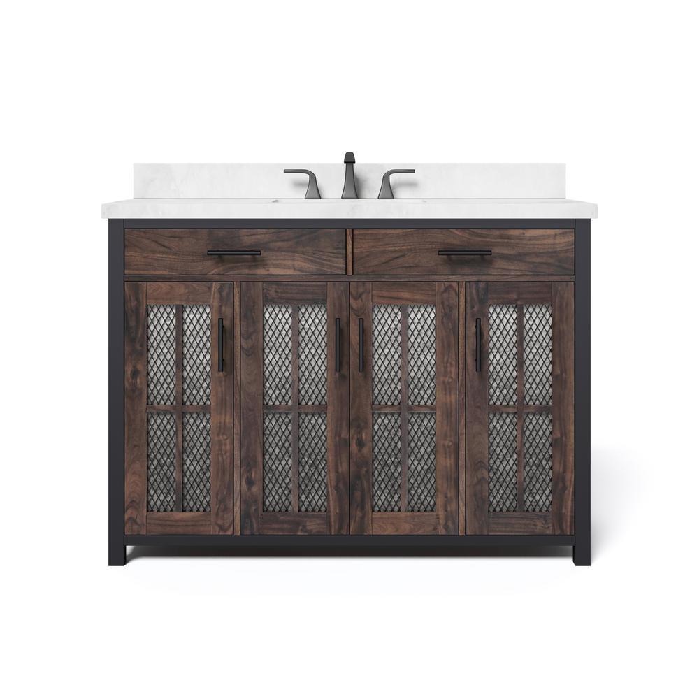 Create a whole new industrial look for your bathroom. This Collection Name 48 in. vanity has a rustic antique brown finish, black steel corner accents and metallic steel mesh door fronts over antiqued mirror glass. The 48 in. x 20 in. subtly veined, white Carrera top with matching 4 in. backsplash features a rectangular under counter ceramic sink. The four cabinet doors have euro-style hinges for slow and quiet operation. You’ll appreciate the plentiful storage space in the open cabinet area, there’s also two tip-out drawers for storing smaller items.