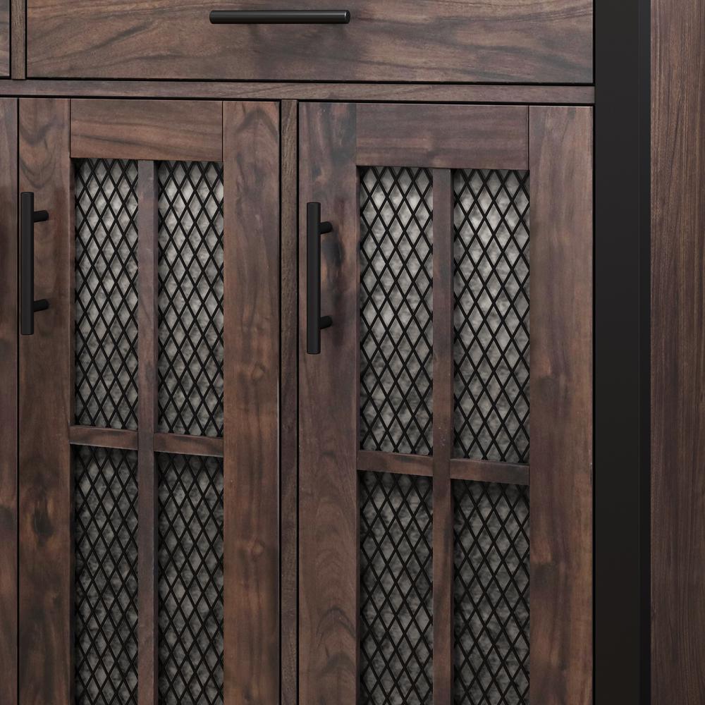 • Antique brown finish, black steel corner accents and steel mesh door fronts