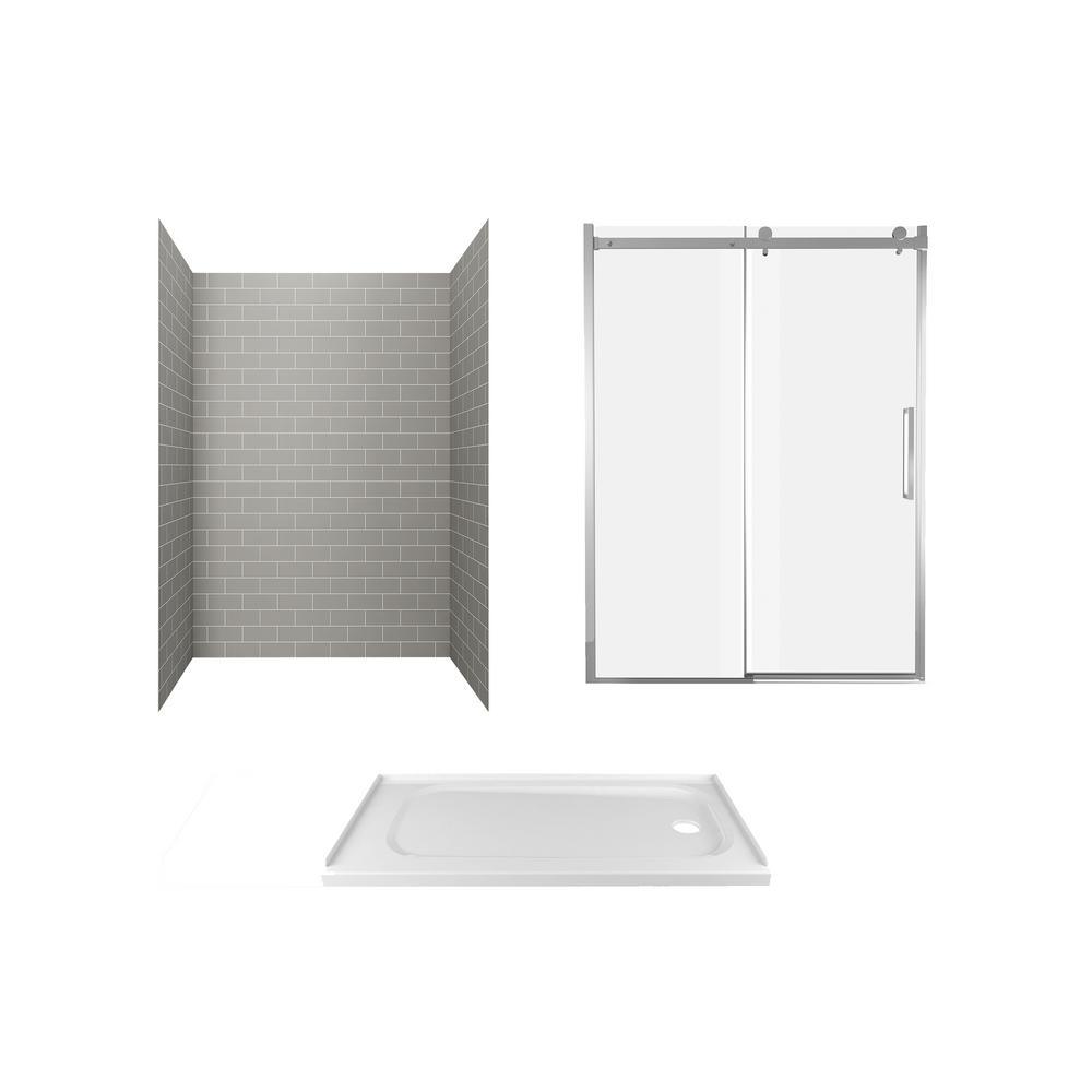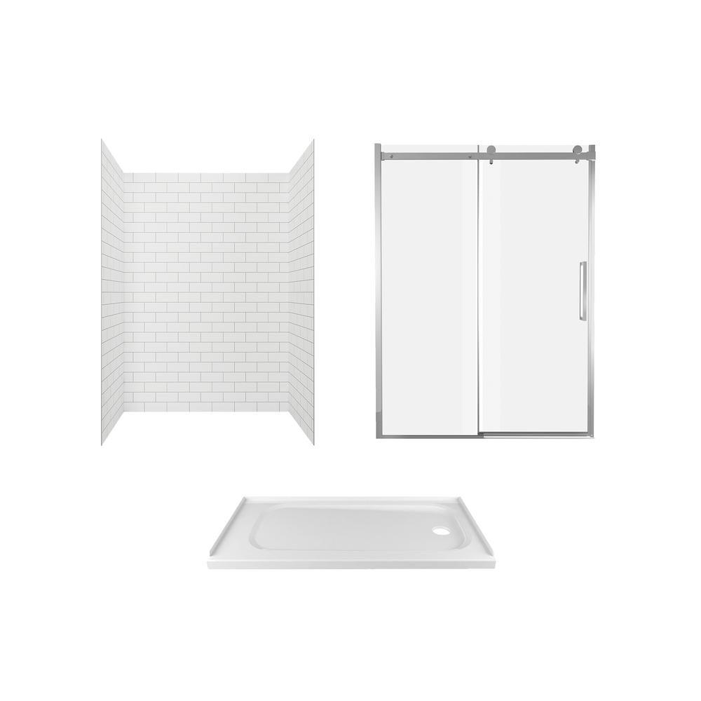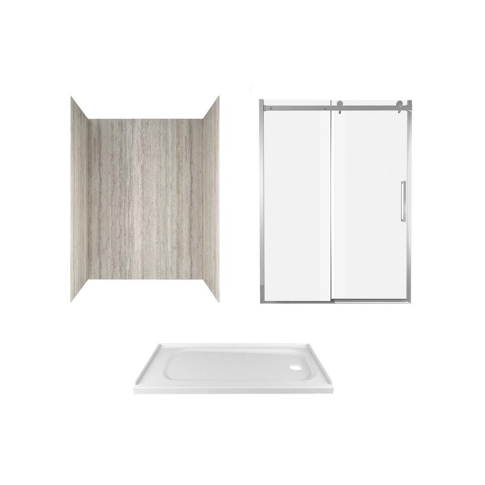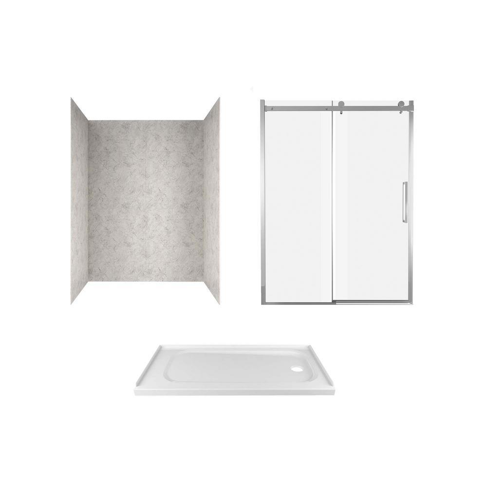 Give your bathroom a fresh update with the Passage Custom Shower Kit, complete with Serene Marble 4-piece shower walls, shower base and frameless shower doors. Easy to install, these durable, pre-cut panels adhere securely to wall-board and feature beautiful, natural finishes for a realistic tile look without the mess of grout. The Passage single, low-threshold shower base is durable and easy to clean, and the perfect size to convert an existing 60 in. x 32 in. bathtub into a shower. To complete your shower base and walls, the passage frameless shower door features Easy-to-Clean glass to help prevent streaking, and smooth-operating barn door rollers for a truly modern look.