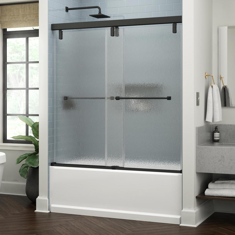 Whether you’re looking for a moderate DIY project or working on a bathroom remodel, upgrading your bathroom with a new sliding shower door is easy with the Delta 1-2-3 custom sliding shower door program. Delta’s custom glass shower door program offers 1000s of design combinations by choosing your glass shower panels, shower door track, and shower door handles to build a unique, personalized glass shower door. Clean, sleek and modern, the Mod bathtub door track in matte black features a soft close system paired with a reversible flat track, and minimal metal components, for the perfect balance of form and function. Show off your beautiful shower with premium, heavy 3/8 in. ANSI certified tempered glass shower panels, featuring Delta Spot Guard with a completely transparent look for a glass shower door that is both simple and elegant.The Everly sliding shower door handles in matte black feature two convenient towel bars for extra bathroom storage in a transitional design silhouette that beautifully combines contemporary and classic qualities.