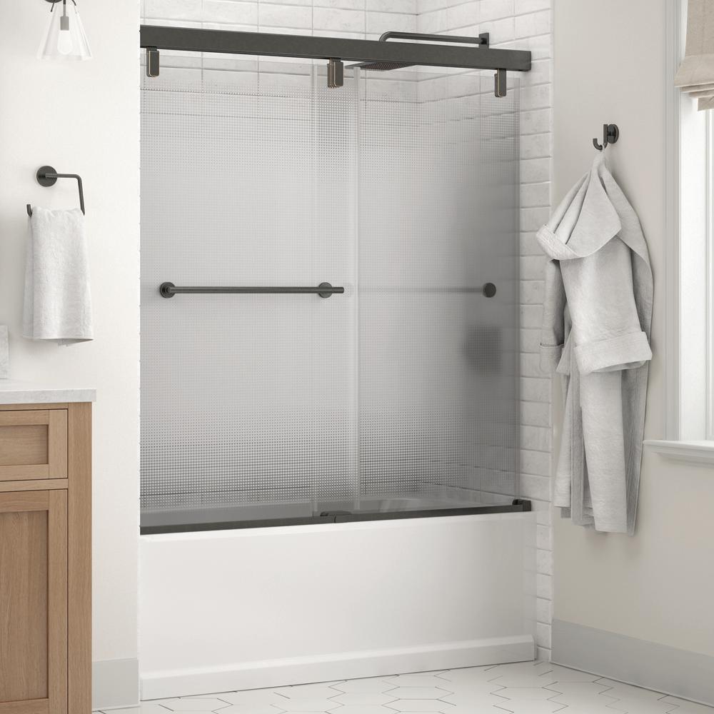 Whether you’re looking for a moderate DIY project or working on a bathroom remodel, upgrading your bathroom with a new sliding shower door is easy with the Delta 1-2-3 custom sliding shower door program. Delta’s custom glass shower door program offers 1000s of design combinations by choosing your glass shower panels, shower door track, and shower door handles to build a unique, personalized glass shower door. Clean, sleek and modern, the Mod bathtub door track in matte black features a soft close system paired with a reversible flat track, and minimal metal components, for the perfect balance of form and function. Make a statement with standard 1/4 in. ANSI certified tempered glass shower panels, featuring a textured surface that resembles water running down the panels for a spa-like feel and the most privacy. The Everly sliding shower door handles in matte black feature two convenient towel bars for extra bathroom storage in a transitional design silhouette that beautifully combines contemporary and classic qualities.