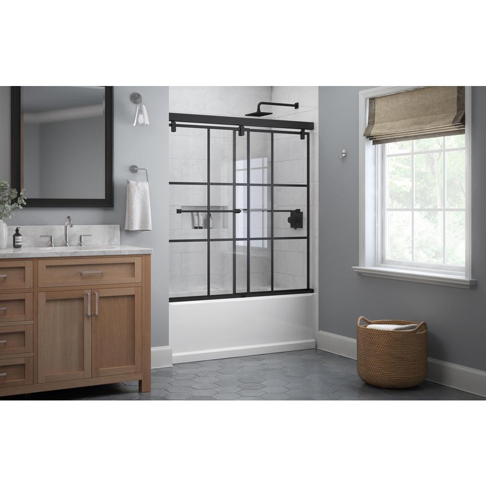 Whether you’re looking for a moderate DIY project or working on a bathroom remodel, upgrading your bathroom with a new sliding shower door is easy with the Delta 1-2-3 custom sliding shower door program. Delta’s custom glass shower door program offers 1000s of design combinations by choosing your glass shower panels, shower door track, and shower door handles to build a unique, personalized glass shower door. Clean, sleek and modern, the Mod bathtub door track in matte black features a soft close system paired with a reversible flat track, and minimal metal components, for the perfect balance of form and function. Make a statement with standard 1/4 in. ANSI certified tempered glass shower panels, featuring a window pane pattern of black muntin bars and clear glass, providing an open, airy feel on easy-to-clean, completely frameless glassThe Everly sliding shower door handles in matte black feature two convenient towel bars for extra bathroom storage in a transitional design silhouette that beautifully combines contemporary and classic qualities.