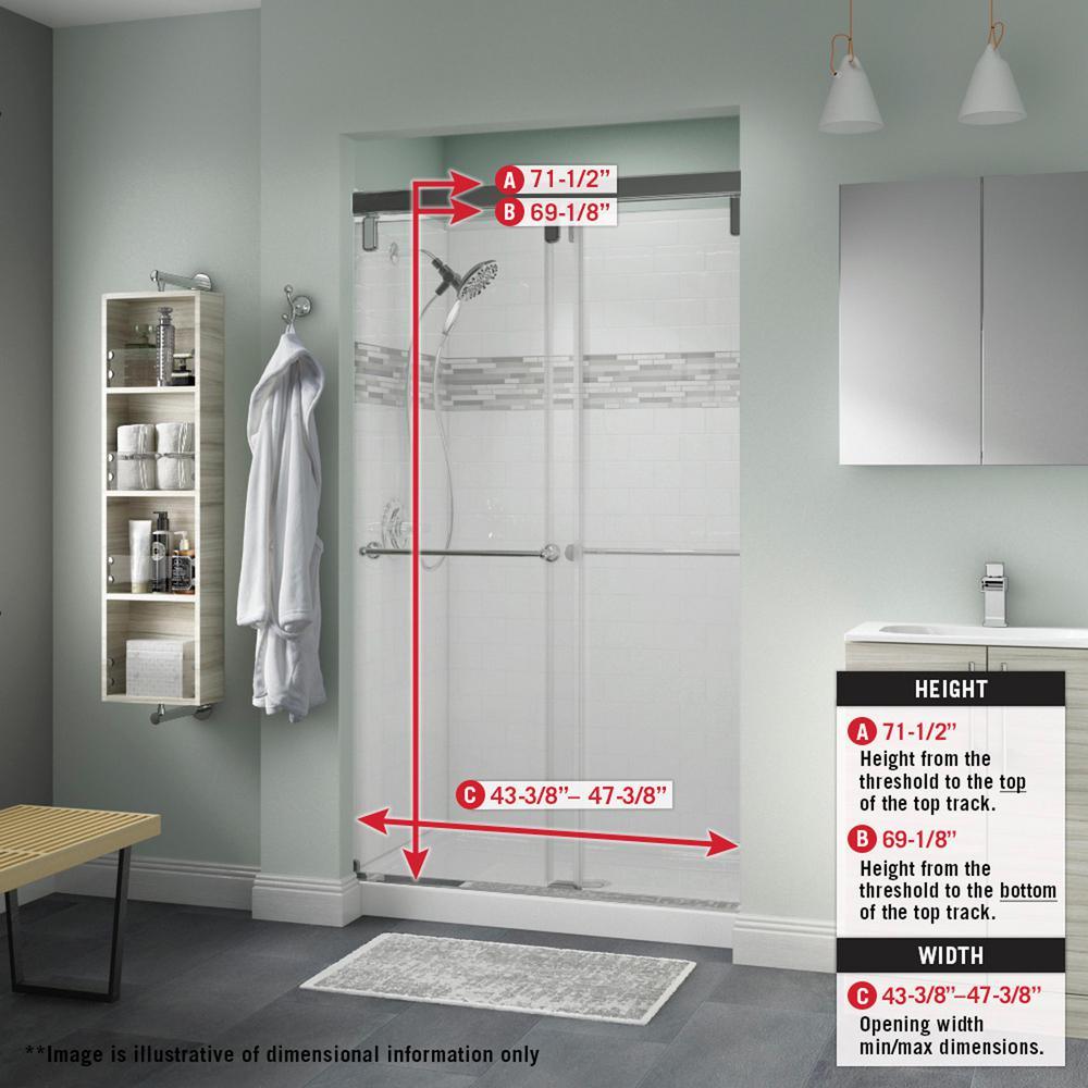 This custom shower door fits openings with a 50-1/8 in. minimum to 58-1/2 in. maximum (127-149 cm) and a 59-1/4 in. height (182 cm) height, offering a walk-in width of 19-3/4 in. to 28 in. (50-71 cm)