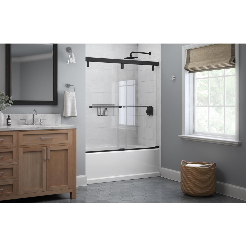 Whether you’re looking for a moderate DIY project or working on a bathroom remodel, upgrading your bathroom with a new sliding shower door is easy with the Delta 1-2-3 custom sliding shower door program. Delta’s custom glass shower door program offers 1000s of design combinations by choosing your glass shower panels, shower door track, and shower door handles to build a unique, personalized glass shower door. Clean, sleek and modern, the Mod bathtub door track in matte black features a soft close system paired with a reversible flat track, and minimal metal components, for the perfect balance of form and function. Show off your beautiful shower with standard 1/4 in. ANSI certified tempered glass shower panels, featuring Delta Spot Guard with a completely transparent look for a glass shower door that is both simple and elegant. The Everly sliding shower door handles in matte black feature two convenient towel bars for extra bathroom storage in a transitional design silhouette that beautifully combines contemporary and classic qualities.