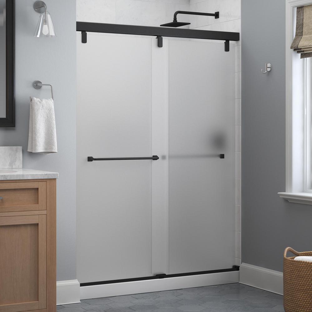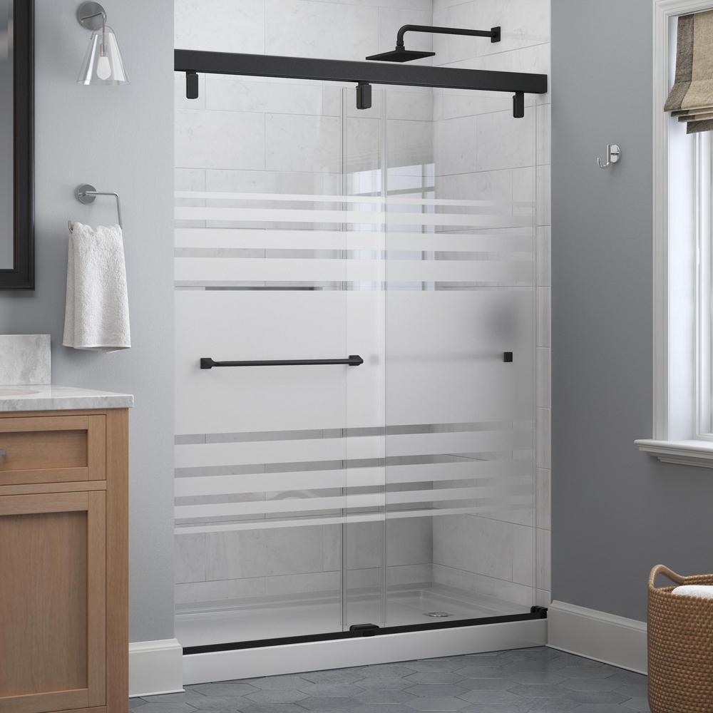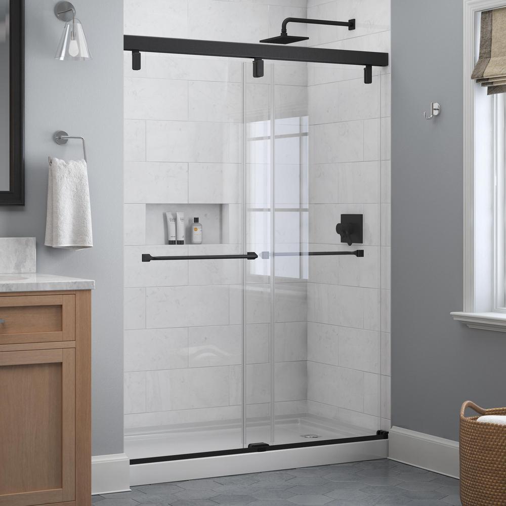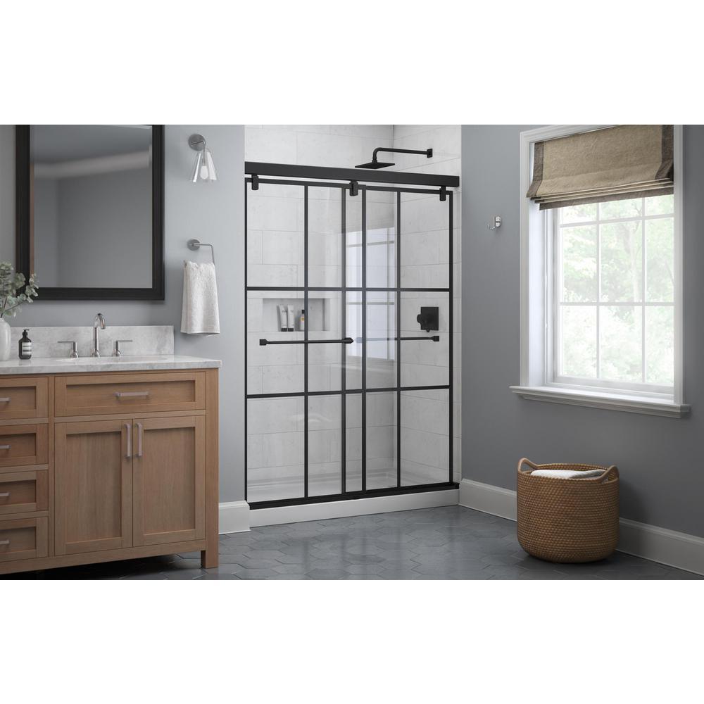 Whether you’re looking for a moderate DIY project or working on a bathroom remodel, upgrading your bathroom with a new sliding shower door is easy with the Delta 1-2-3 custom sliding shower door program. Delta’s custom glass shower door program offers 1000s of design combinations by choosing your glass shower panels, shower door track, and shower door handles to build a unique, personalized glass shower door. Clean, sleek and modern, the Mod shower door track in matte black features a soft close system paired with a reversible flat track, and minimal metal components, for the perfect balance of form and function. Make a statement with standard 1/4 in. ANSI certified tempered glass shower panels, featuring a window pane pattern of black muntin bars and clear glass, providing an open, airy feel on easy-to-clean, completely frameless glassThe Everly sliding shower door handles in matte black feature two convenient towel bars for extra bathroom storage in a transitional design silhouette that beautifully combines contemporary and classic qualities.