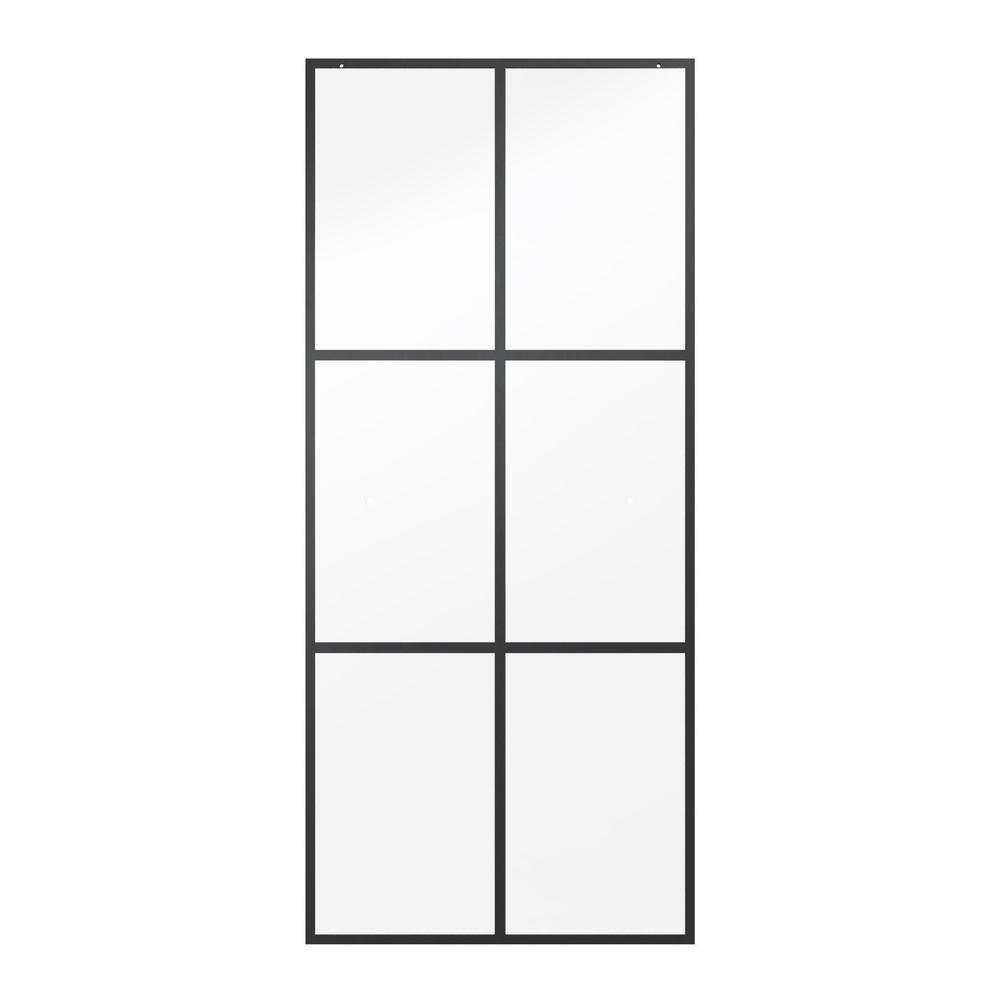 Features a window pane pattern of black muntin bars and clear glass, providing an open, airy feel on easy-to-clean, completely frameless glass