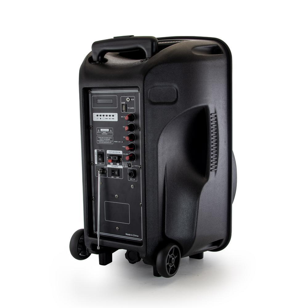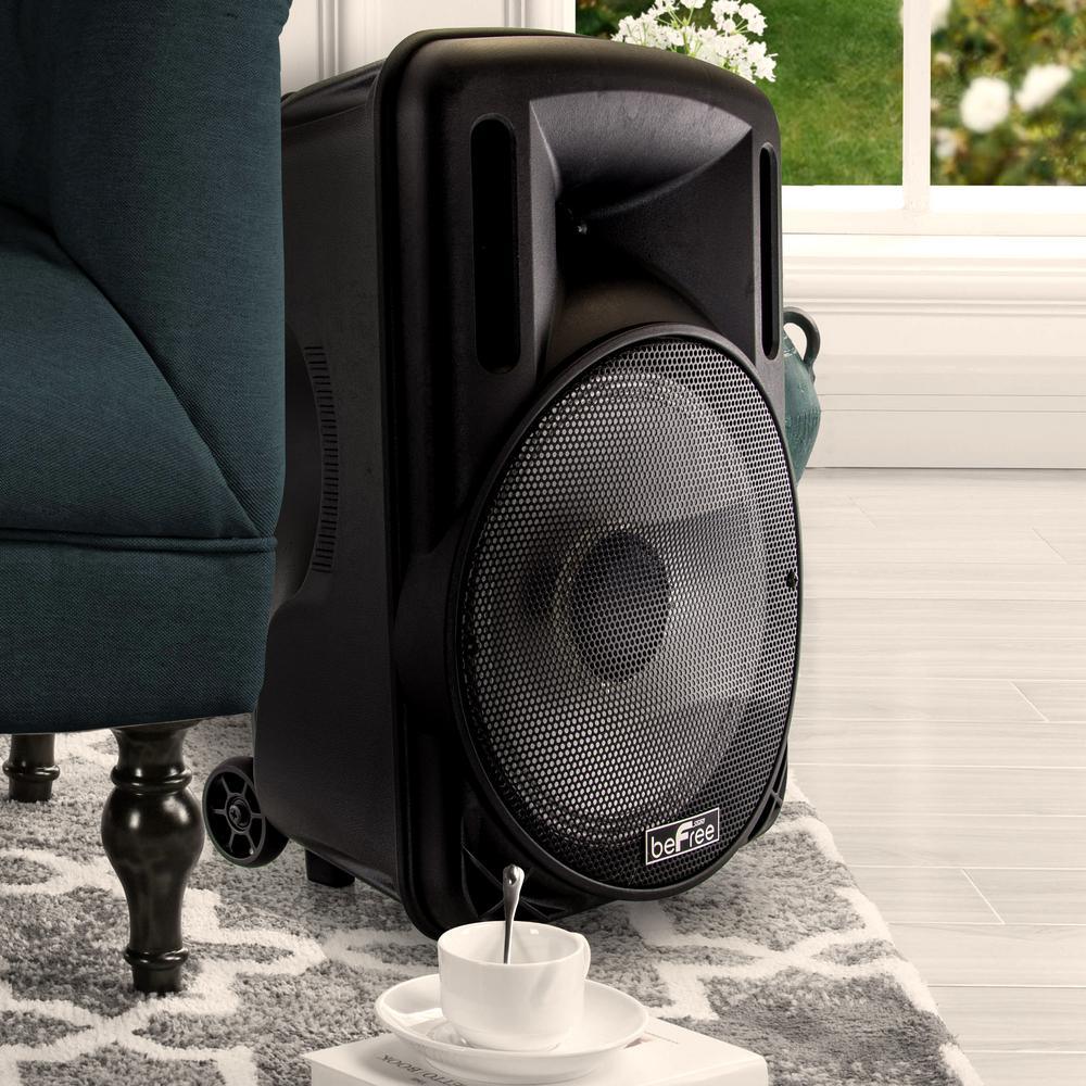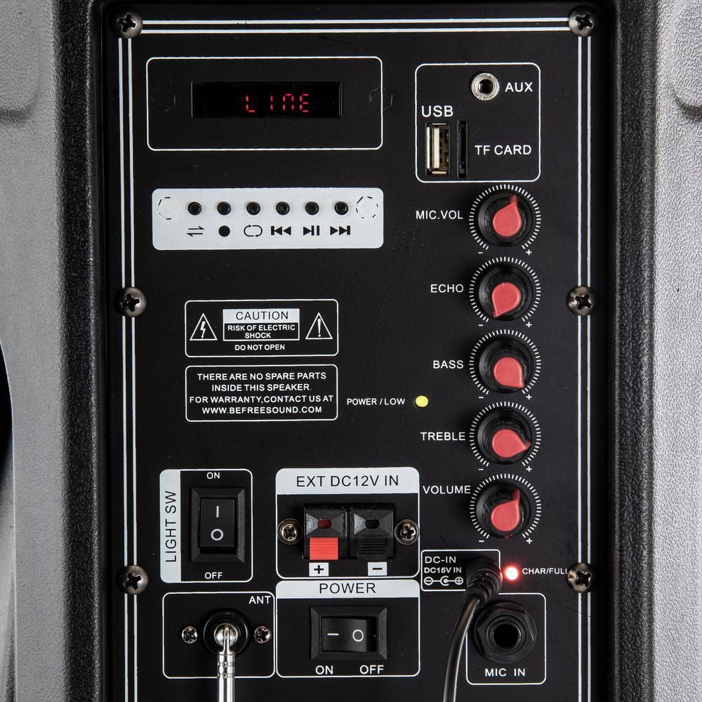 The BEFREE SOUND 12 in. 2500-Watt Bluetooth Portable Party Speaker with illuminating lights brings more power and sound to house parties and other events. Dazzle the stage with an array of illuminating light patterns built into the speaker. Bring along to camping trips or backyard barbeques, with the portable handle bars and wheels this party speaker can go anywhere. Great for an at home or dive bar karaoke night; this sound set comes with a microphone as well function karaoke controls. Never let the party simmer down, the 12-Volt rechargeable battery can last till the night ends.