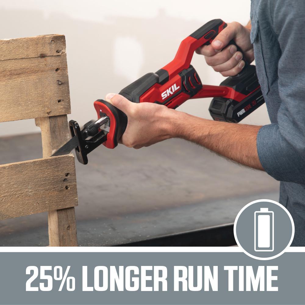The Must-Have, Multi-Purpose DIY Power Saw. Make multiple DIY projects easier with the Skil 20-Volt Reciprocating Saw, featuring a 1 in. stroke and up to 3,000 strokes per minute. This cordless electric saw is powerful enough to cut through several materials such as wood, tree branches, fiberglass, metal, plaster, masonry, drywall and even nails. Its exposed blade makes it easy to cut through materials in tight places and the lightweight design allows easy handling. This power saw comes with a PWRCore 20-Volt 2.0 Ah Lithium Battery and 20-Volt Charger.