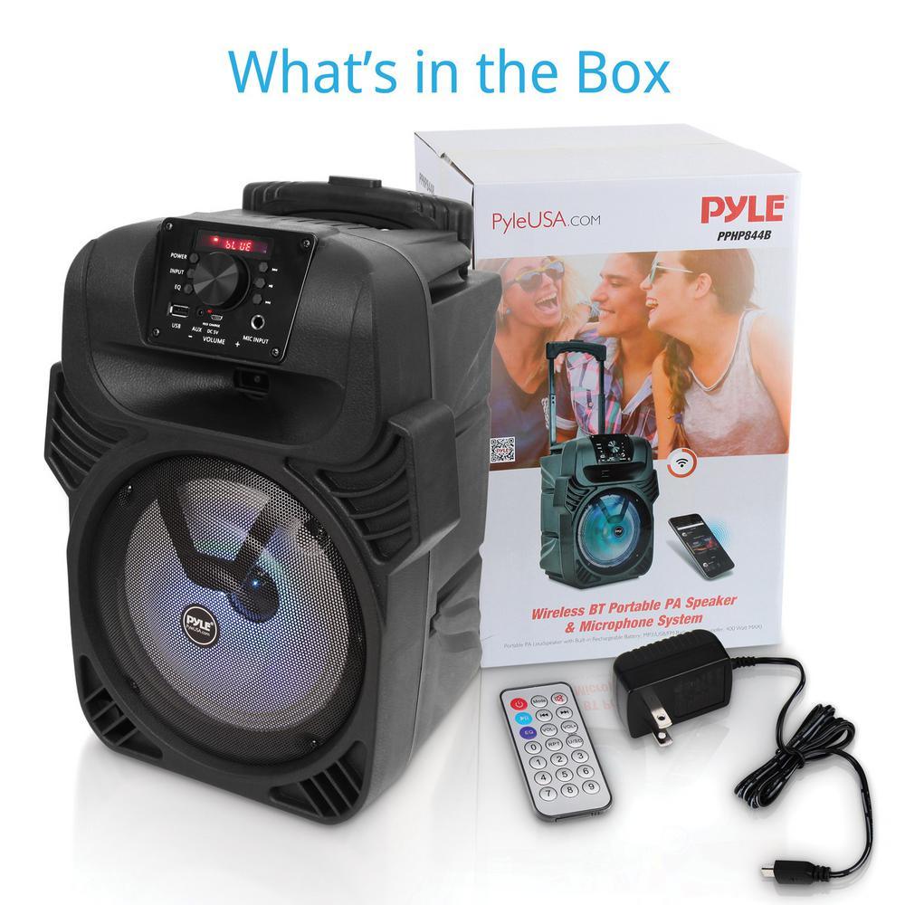 Get the party started indoors or outdoors with the Pyle PPHP844B Portable Bluetooth PA Speaker and Microphone System This system is ideal for public gatherings, crowd control, and karaoke. Convenient rolling wheels and the extendable carry handle make this speaker truly portable, so you can take the party with you.