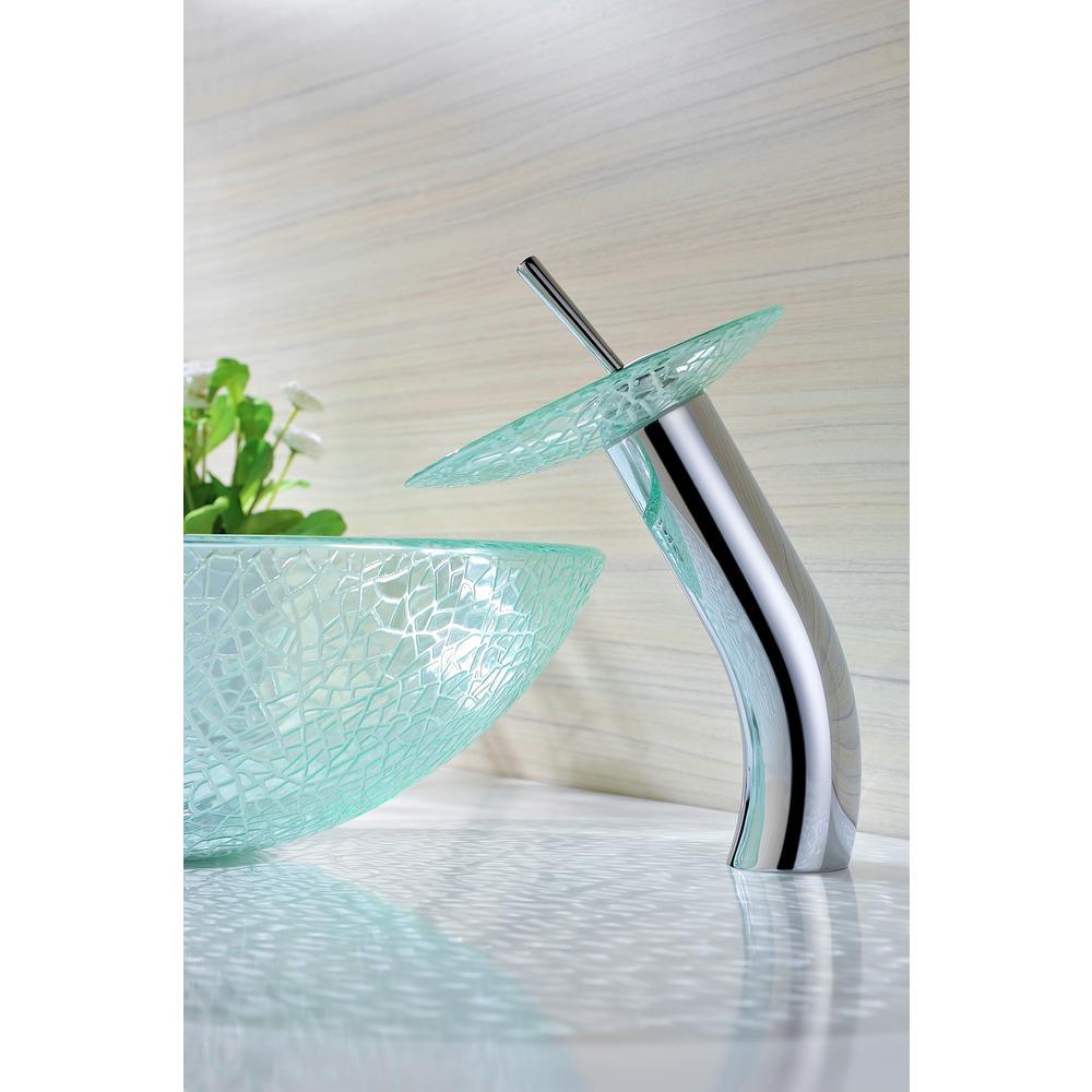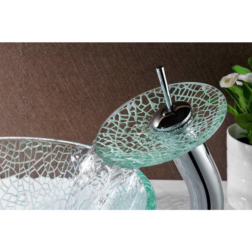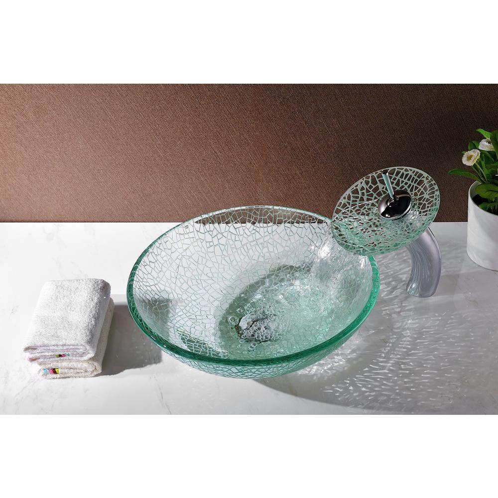 Paeva Deco-Glass Vessel Sink in Crystal Clear Chipasi with Matching Chrome Waterfall Faucet