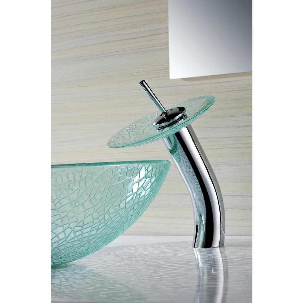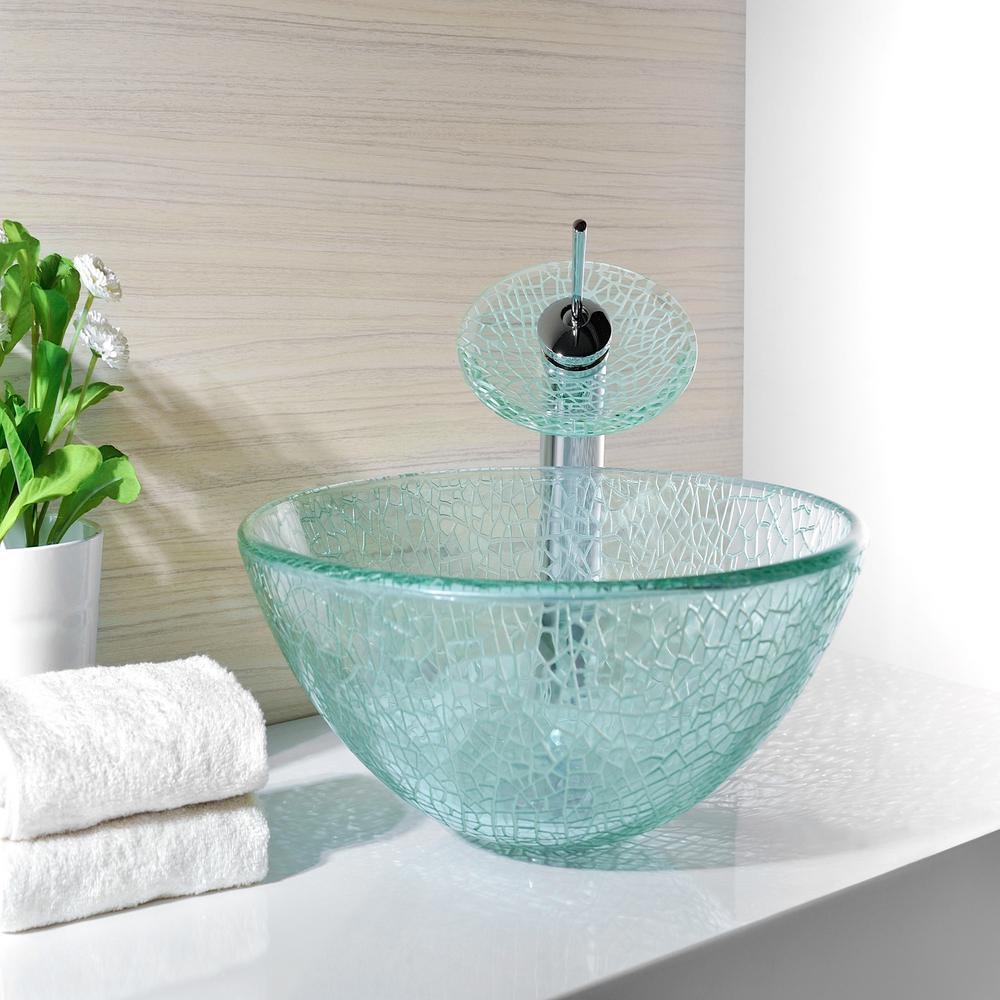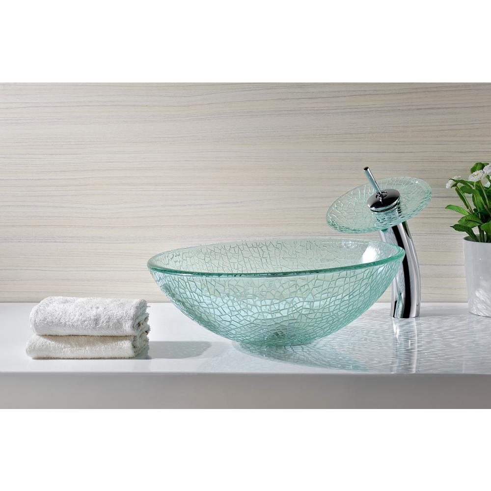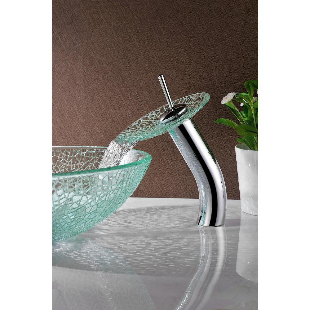 Paeva Deco-Glass Vessel Sink in Crystal Clear Chipasi with Matching Chrome Waterfall Faucet