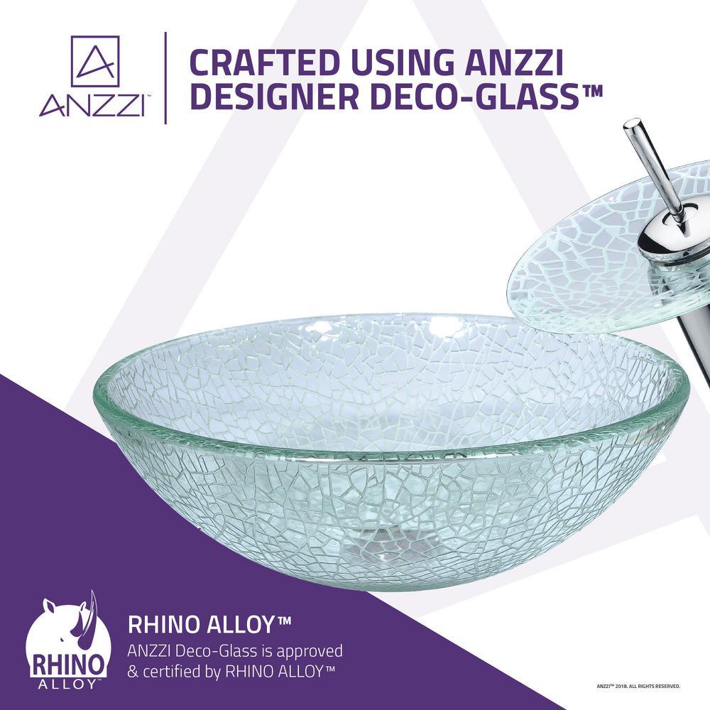 The ANZZI Paeva Series sink is a traditionally crafted round vessel sink adorned in a Crystal Clear Chipasi Finish. Each ANZZI vessel sink is formed using RHINO ALLOY certified high tempered Deco-Glass material. Additionally a matching Deco-Glass and chrome single handle waterfall faucet is bundled with vessel sink as a set. The result is a dynamically shaped and captivating vessel centerpiece for any bathroom counter.