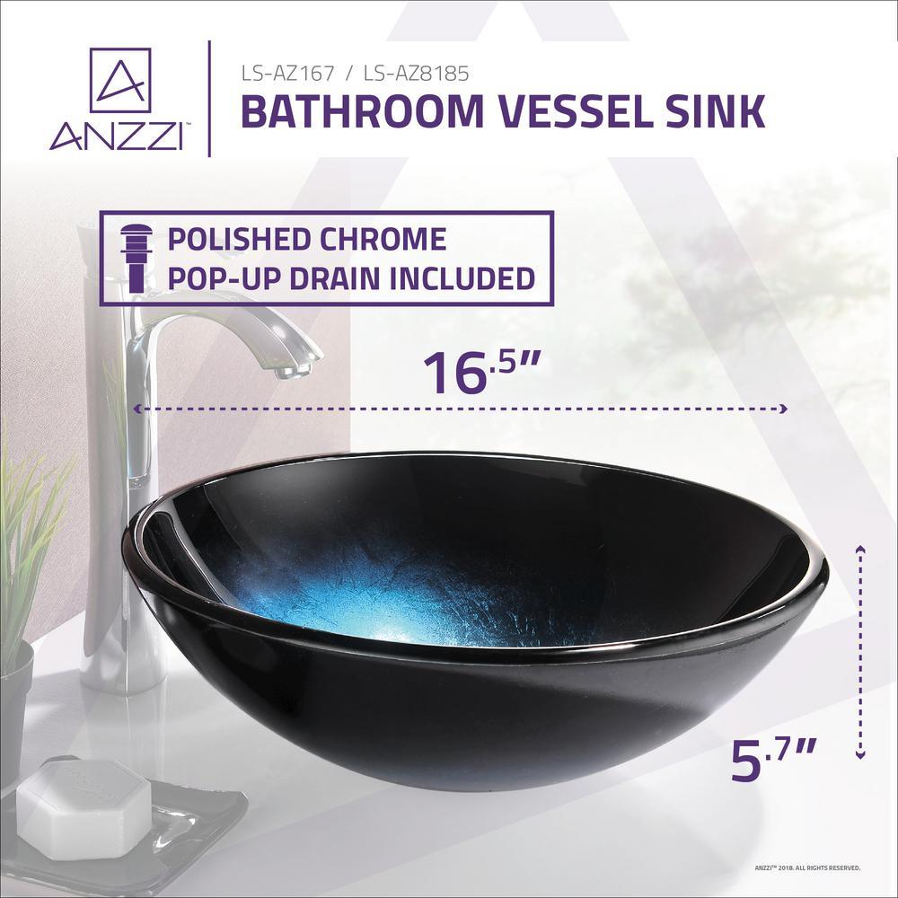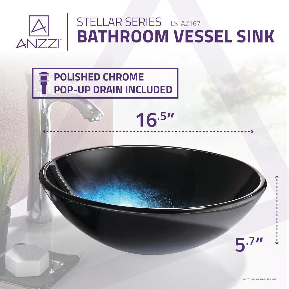 The ANZZI Tara Series sink is a traditionally crafted round vessel sink adorned in a Deep Sea finish. Each ANZZI vessel sink is formed using RHINO ALLOY certified high tempered Deco-glass material. The result is an elegantly shaped and captivating vessel centerpiece for any bathroom counter.