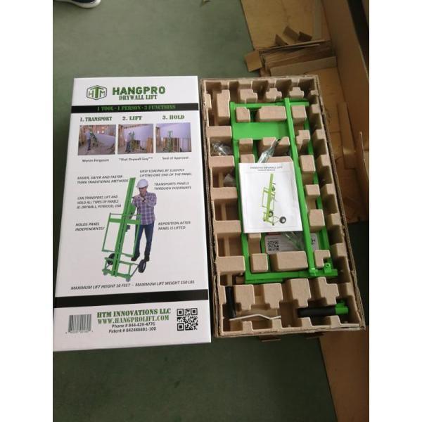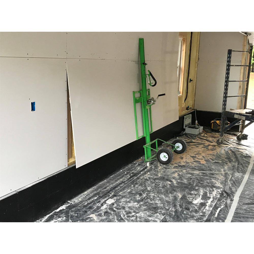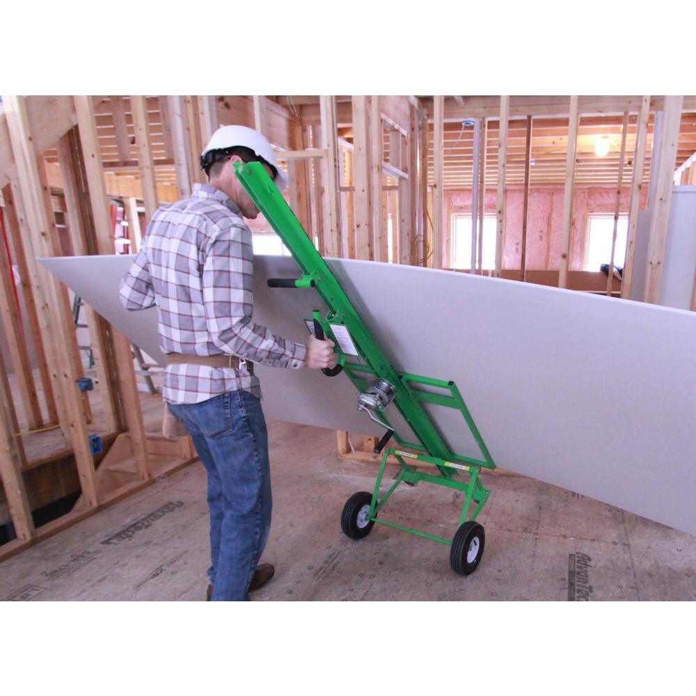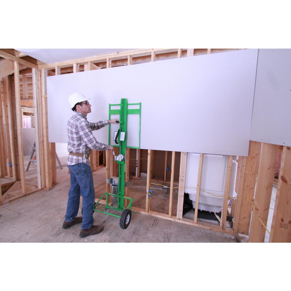 HangPro Drywall Lift for WALLS allows one person to transport, lift, adjust and hold any panel shaped material easily and safely. The HangPro is the only lift made specifically to hang upper and lower panels on vertical surfaces. You never again have to drag heavy panels from site to site or lift or hold heavy panels on walls, the HangPro does all of that exhausting work for you. Easy to operate, moves like a hand truck and allows anyone to transport panels or hang panels on walls. Panel only needs to be raised a few inches on one end and rocked onto the cradle ledge so no more lifting a panel. In a typical building 2/3 of the drywall is hung on walls and should be hung horizontally as there is less lineal footage of seams to mud. The HangPro can be used with any panel shaped material including drywall, OSB, plywood, insulation, cement board, siding, steel doors, large metal signs, etc. The HangPro increases production as larger panels can be hung so less seams to finish while the work is less strenuous and safer. Great for DIY, contractors or rental companies. 1 Tool 1 Person 4 Functions Transport Lift Adjust Hold