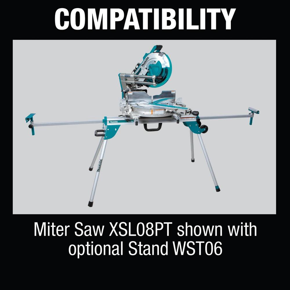 Makita is a pioneer in brushless motor engineering, battery technology, and miter saw innovation. This combined expertise resulted in the 18-Volt X2 LXT (36-Volt) Lithium-Ion Brushless 12 in. Dual Bevel Sliding Compound Miter Saw Kit (XSL08PT), AWS and Laser. It's powered by two 18-Volt Lithium-Ion batteries for 36-Volt power and performance, but without leaving the 18-Volt LXT platform. X2 LXT technology delivers increased power, speed, and run time, without the hassles of a cord. Get up to 175 cuts per charge in 2x12 SPF lumber with two 5.0Ah batteries. The efficient BL Brushless Motor runs cooler and more efficiently for longer tool life and delivers up to 4,400 RPM for fast and smoother cutting. The XSL08PT also features Automatic Speed Change technology to adjust cutting speed and torque under load for optimum performance. The XSL08PT has a unique 2-steel rail sliding system design that offers single slide-glide operation for smooth and dead-on accurate cutting right out of the box, as well as a reduced overall footprint that allows the saw to be positioned flush against a wall. The innovative direct-drive gearbox and guard system is engineered for increased vertical cutting capacity (6-3/4 in.), crown molding cutting capacity (8 in. nested), and 15 in. crosscuts at 90°. This Promotion also comes with a bonus WST06 Compact Folding Miter Saw Stand.