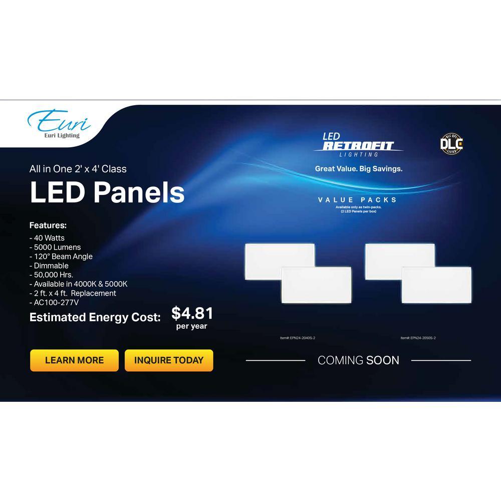 EPN24-2050S-2 thoughtfully designed for superior illumination, ultimate efficiency, and easy installation, this 2x4 LED panel offers a larger driver for more space when wiring and a sturdy concave-convex backplate for no light leakage. Double-sided welding provides a seamless, polished frame and PMMA material guarantees perfect light output without the risk of yellowing. Available in flicker-free Cool White (5000K), this retrofit LED panel delivers 5000 lumens with just 40 watts. Look for EPN24-2040S-2 for Bright White (4000K) or EPN22-2050S-2 for 2x2 size *Note: Available only as a twin-pack. EPN24-2050S-2 contains 2 LED Panels.