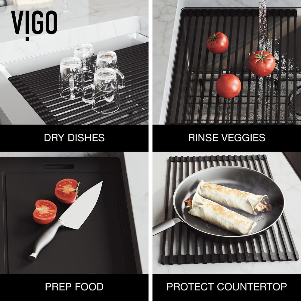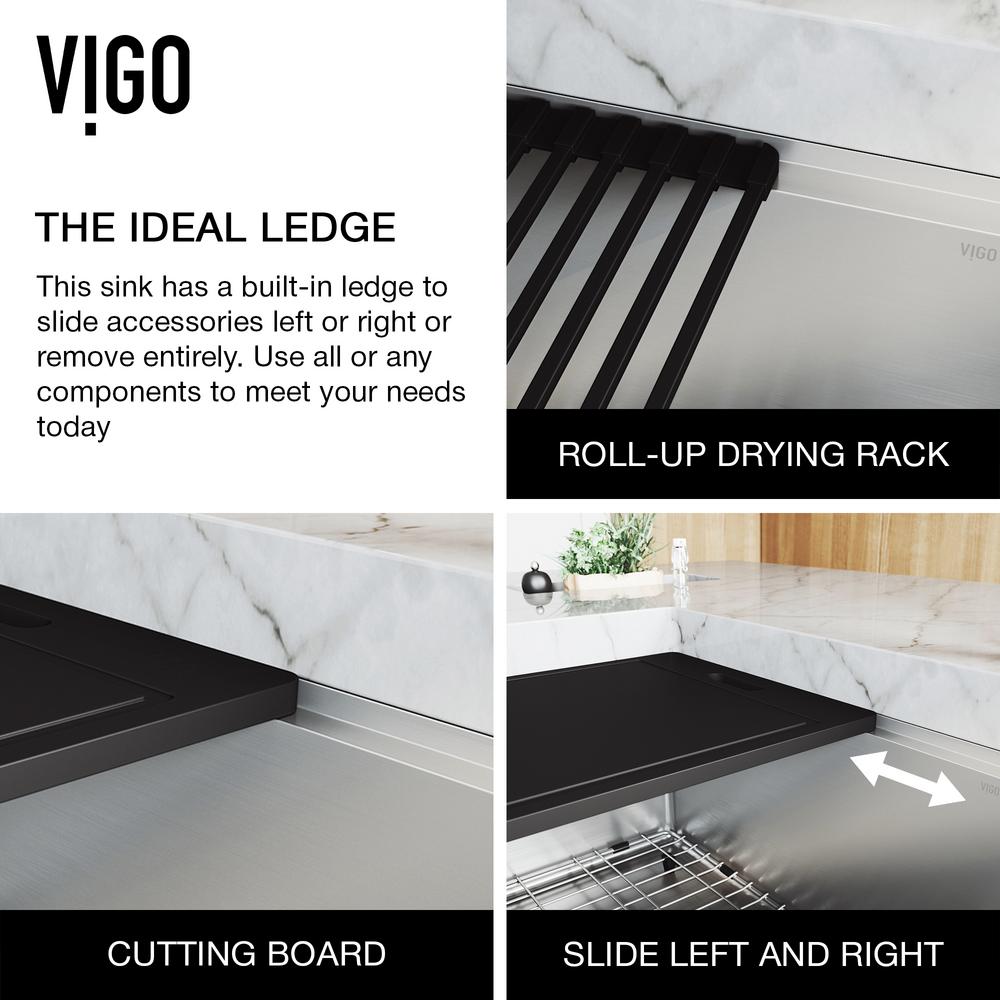 Make efficiency a stylish addition to your kitchen with the VIGO Oxford Workstation. This double-bowl kitchen sink kit lets you multitask without the mess. It includes the highest quality 304-series stainless steel kitchen sink, undercoated with VIGO's proprietary SoundAbsorbTM technology to prevent noise and condensation. Made with an internal built-in ledge, this sink holds the included cutting board and roll-up silicone drying rack. Both components can slide in and out of the sink, available when you need them and removable when you don't. Complete with 2 protective bottom sink grids and 2 stainless steel kitchen sink strainers, the Oxford makes it easier than ever to love your kitchen today.