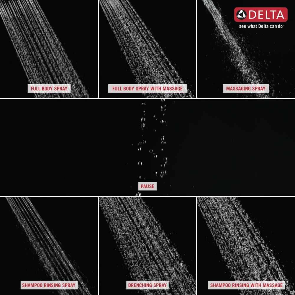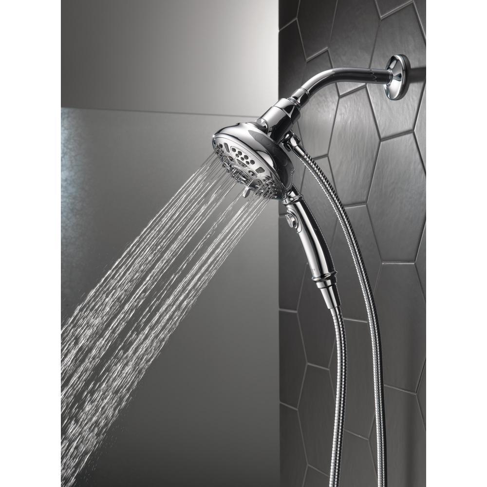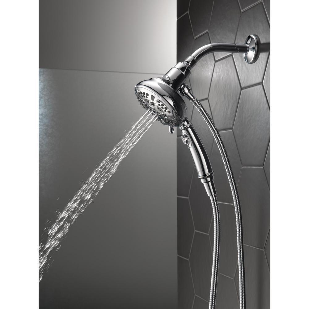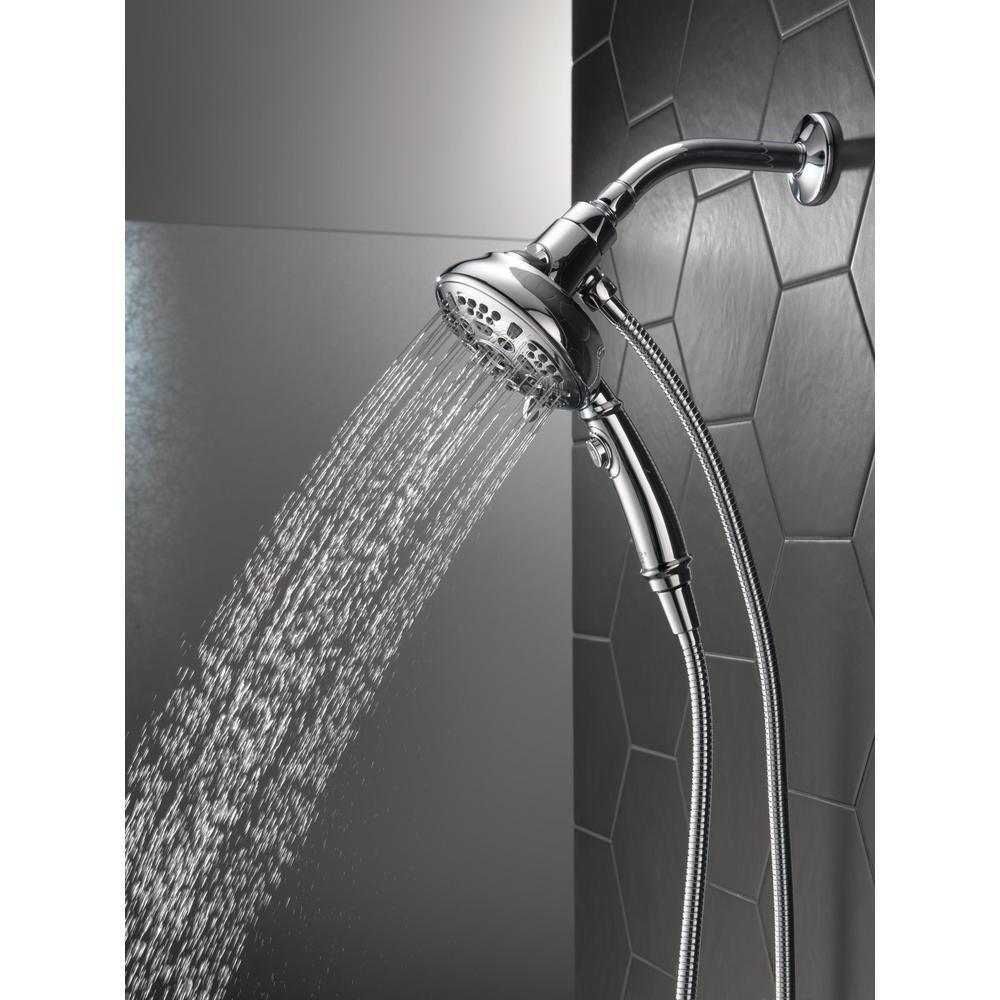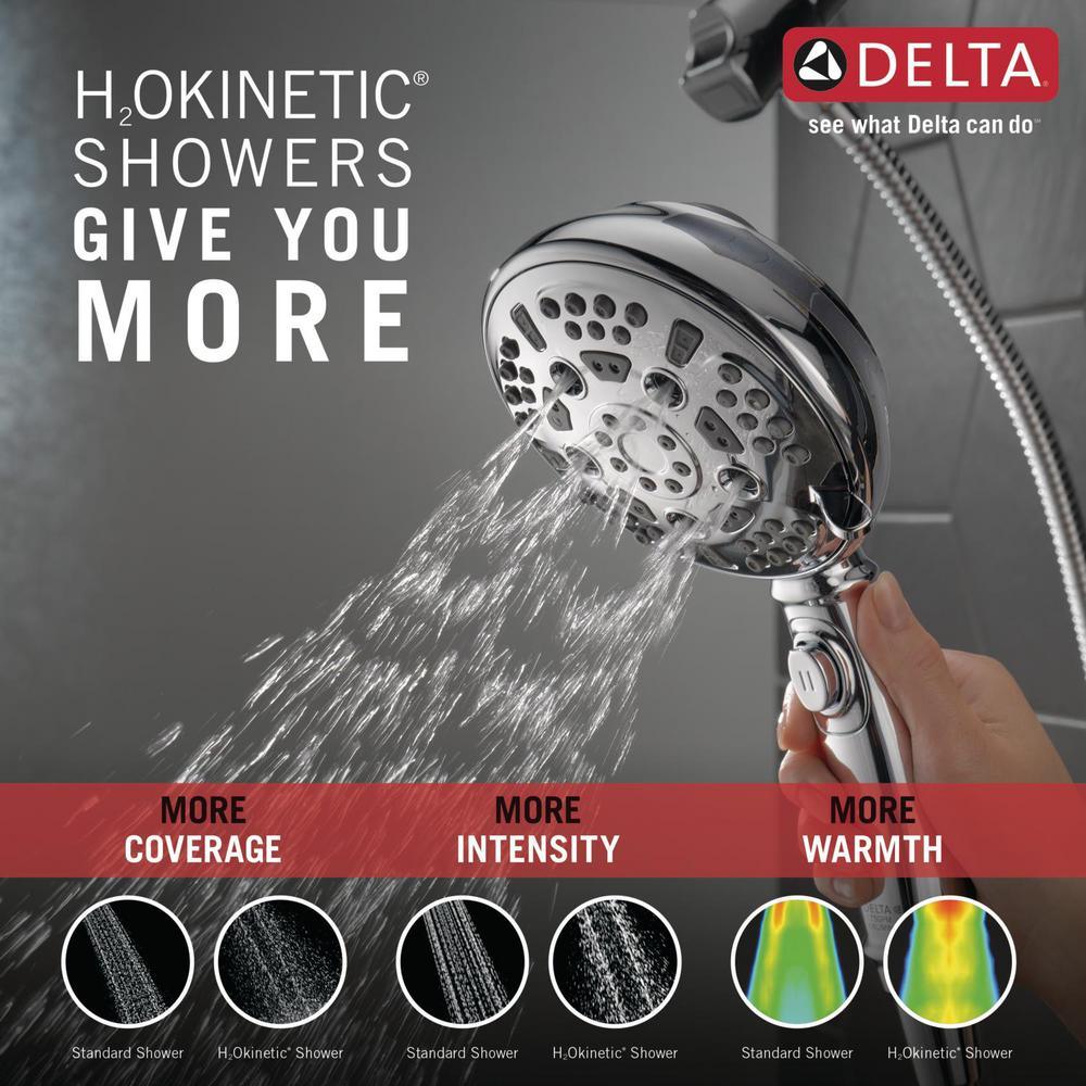 Delta Sure Dock Hand Showers bring reliable docking within reach. A sturdy hook on the back of the shower head ensures it mounts securely every time. The location of the mount on the back of the shower head lowers the handle to a more easily-accessible height, so you can remove, use and redock your hand shower with ease. Delta H2Okinetic Power Drench Showers look different because they are different. H2Okinetic showers are powered by an innovative technology that sculpts the water into a unique wave pattern, giving you the feeling of more water without using more water and creating a shower with more warmth, coverage and intensity. So go ahead and indulge, because now you can enjoy the feeling of more water without using more water. While other products may gather unsightly mineral build-up over time, Delta soft rubber Touch-Clean spray holes allow any mineral residue to simply be wiped away for an instantly refreshed look with no need for soaking or the aid of chemical cleaners. The pause setting gives you ample space for shaving, lathering and other shower tasks, without worrying about overspray or water waste. This spray setting helps you conserve water, so you can worry less about depleting your supply of hot water - and you help the environment too. Delta Water Sense labeled faucets, showers and toilets use at least 20% less water than the industry standard saving you money without compromising performance.