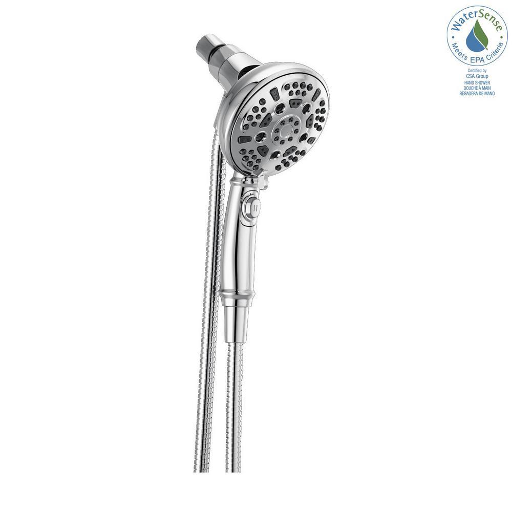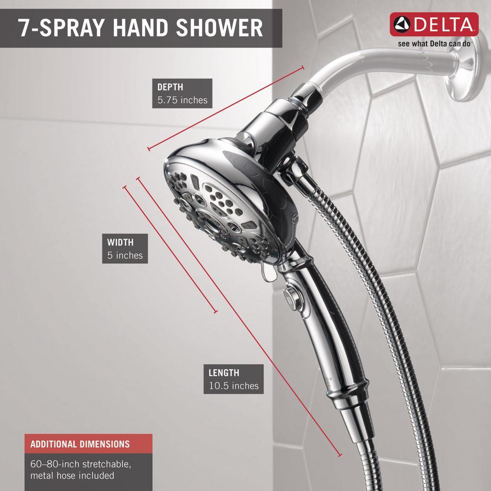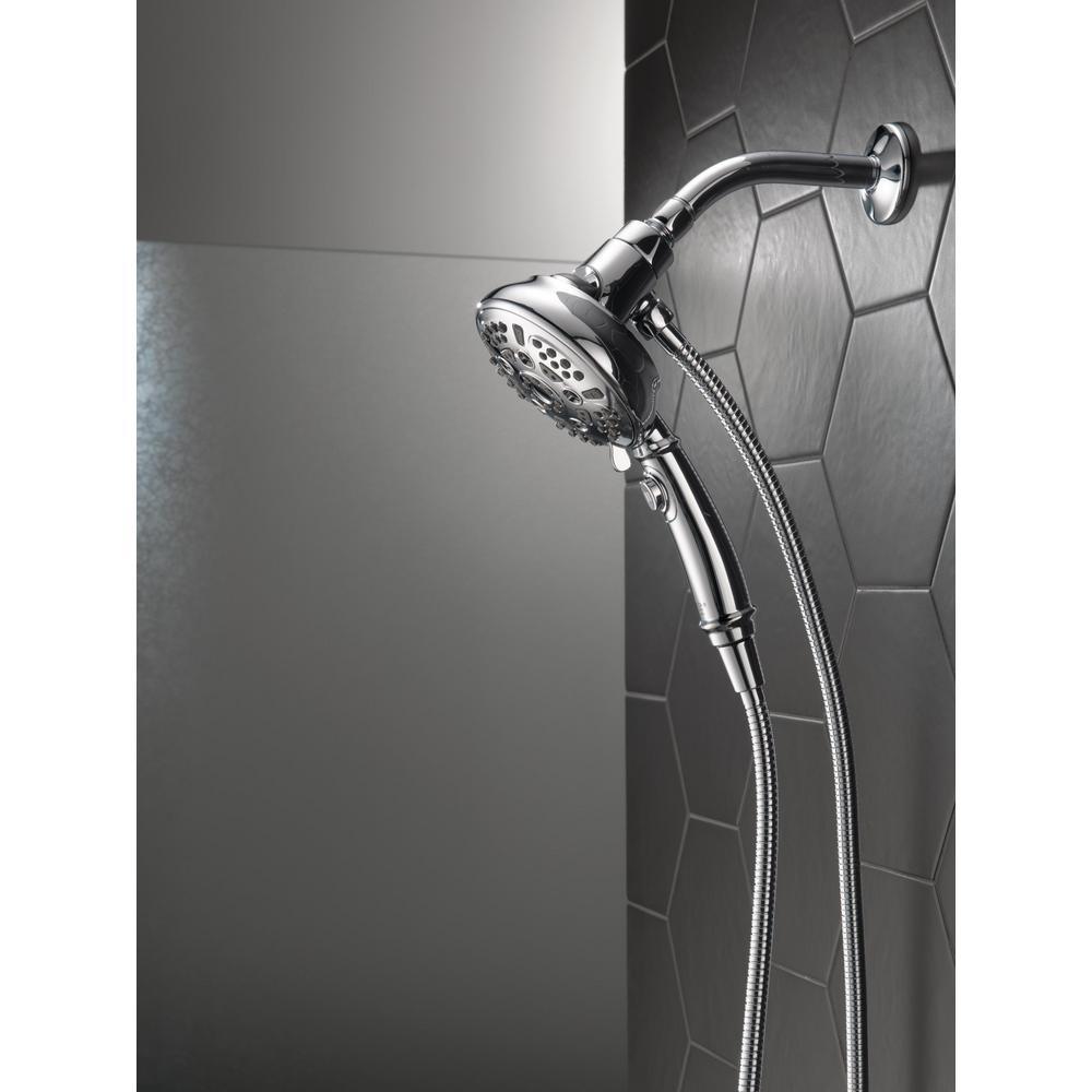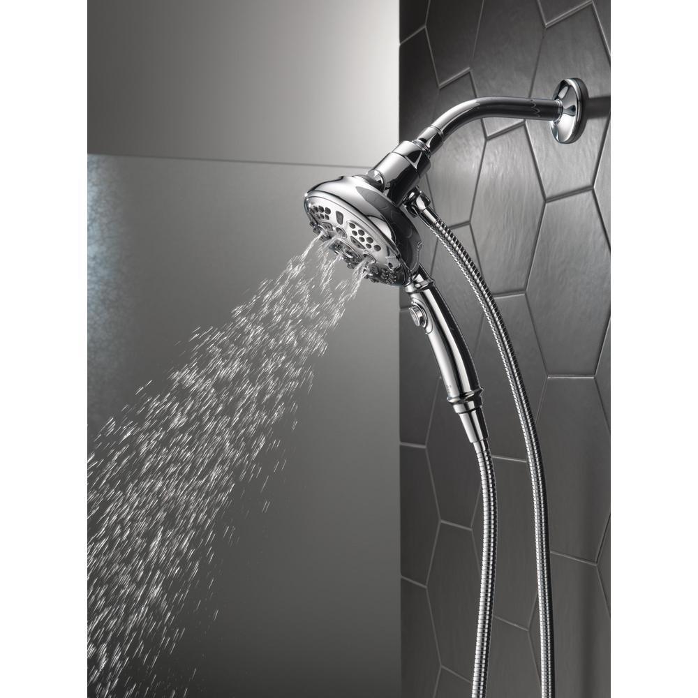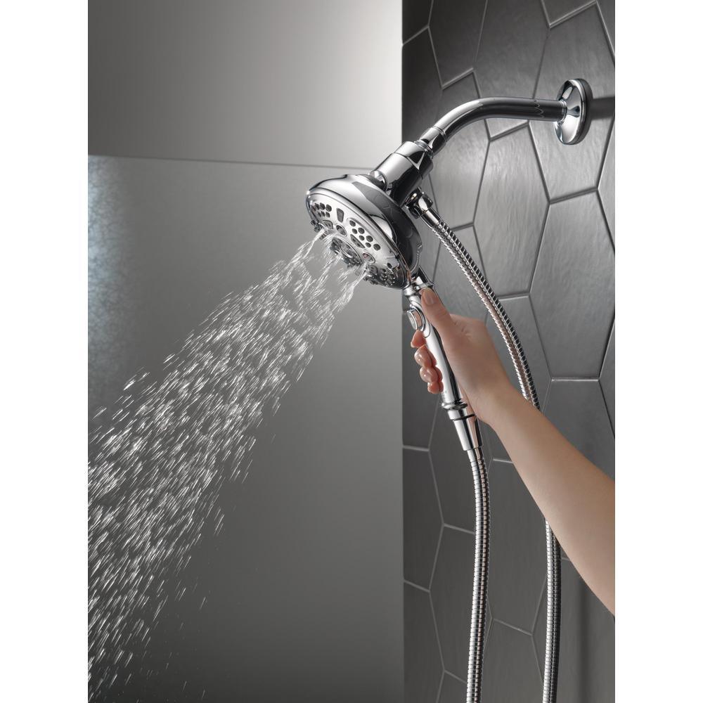 Delta Sure Dock Hand Showers bring reliable docking within reach. A sturdy hook on the back of the shower head ensures it mounts securely every time. The location of the mount on the back of the shower head lowers the handle to a more easily-accessible height, so you can remove, use and redock your hand shower with ease. Delta H2Okinetic Power Drench Showers look different because they are different. H2Okinetic showers are powered by an innovative technology that sculpts the water into a unique wave pattern, giving you the feeling of more water without using more water and creating a shower with more warmth, coverage and intensity. So go ahead and indulge, because now you can enjoy the feeling of more water without using more water. While other products may gather unsightly mineral build-up over time, Delta soft rubber Touch-Clean spray holes allow any mineral residue to simply be wiped away for an instantly refreshed look with no need for soaking or the aid of chemical cleaners. The pause setting gives you ample space for shaving, lathering and other shower tasks, without worrying about overspray or water waste. This spray setting helps you conserve water, so you can worry less about depleting your supply of hot water - and you help the environment too. Delta Water Sense labeled faucets, showers and toilets use at least 20% less water than the industry standard saving you money without compromising performance.