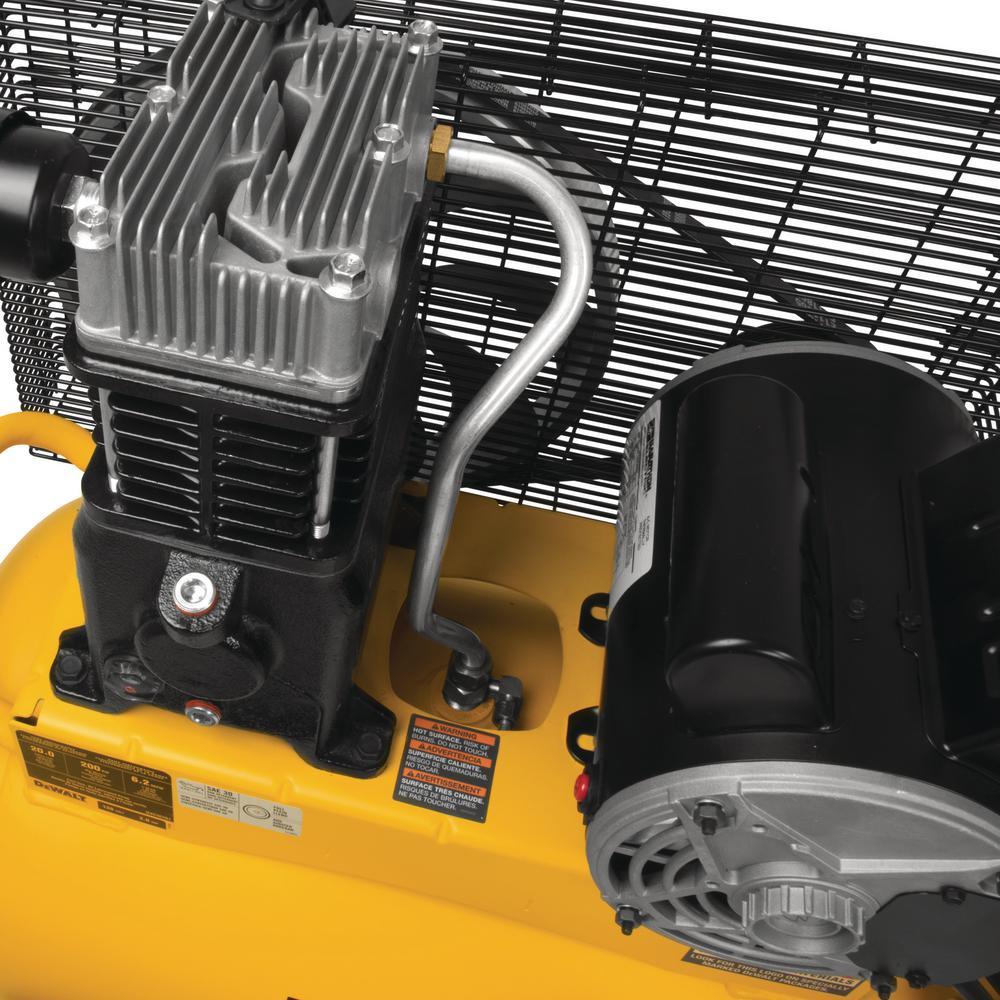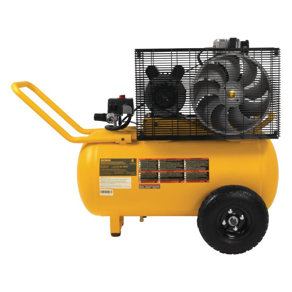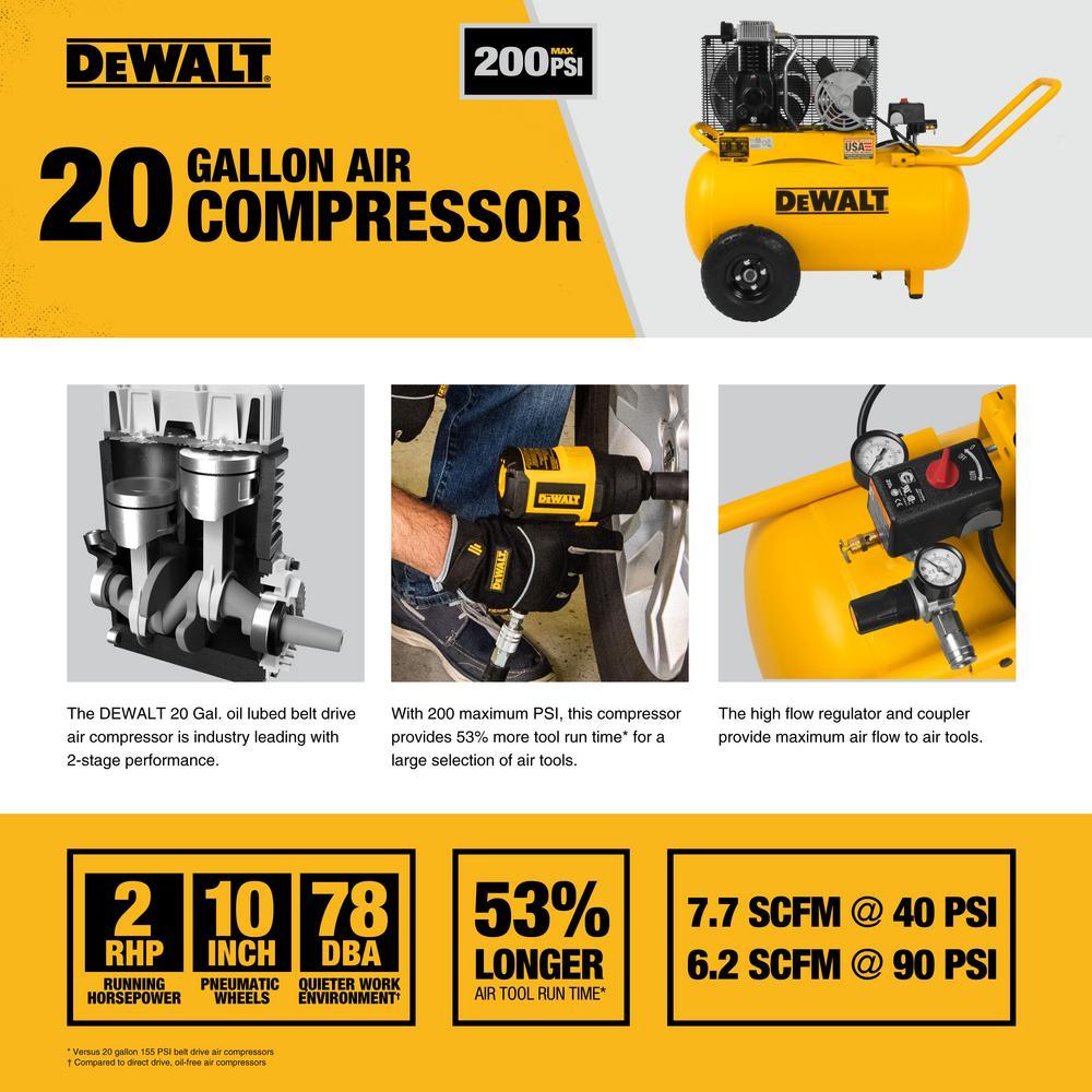 The DEWALT 20 Gal. oil lubed belt drive air compressor is industry leading with 2-stage performance. With 200 maximum PSI, this air compressor provides 53% more air tool run time versus 20 Gal. 155 PSI compressors. At 78 dBA, the oil lubricated twin cylinder pump with cast iron construction allows for a quieter work environment. The 10 in. pneumatic wheels allow easy transport on jobsites and inside your garage or shop. The DEWALT 25 Gal. 200 PSI air compressor is perfect for light automotive tasks, medium duty metal working and agricultural equipment repairs.