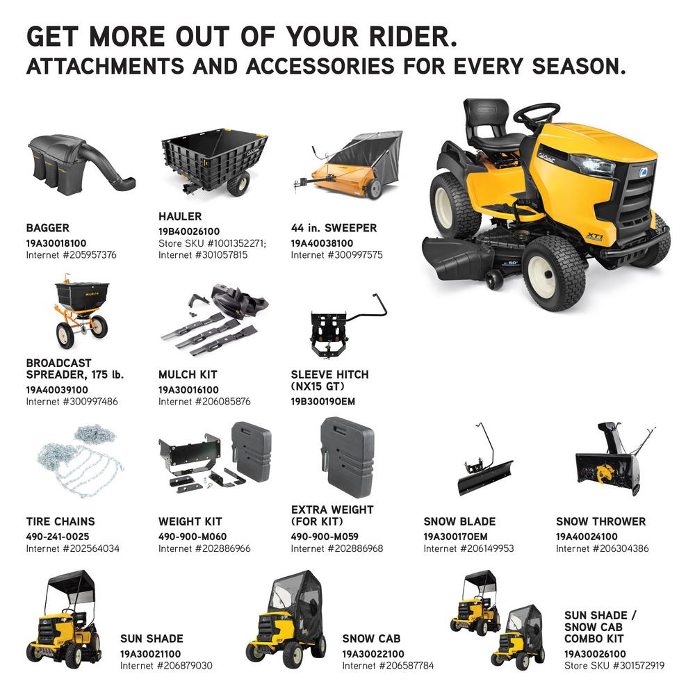 • Optional multi-seasonal attachments provide year-round versatility, including a twin bagger, snow thrower, sun shade/snow cab, snow blade, mulch kit, steel and poly carts and a rear spreader (sold separately)