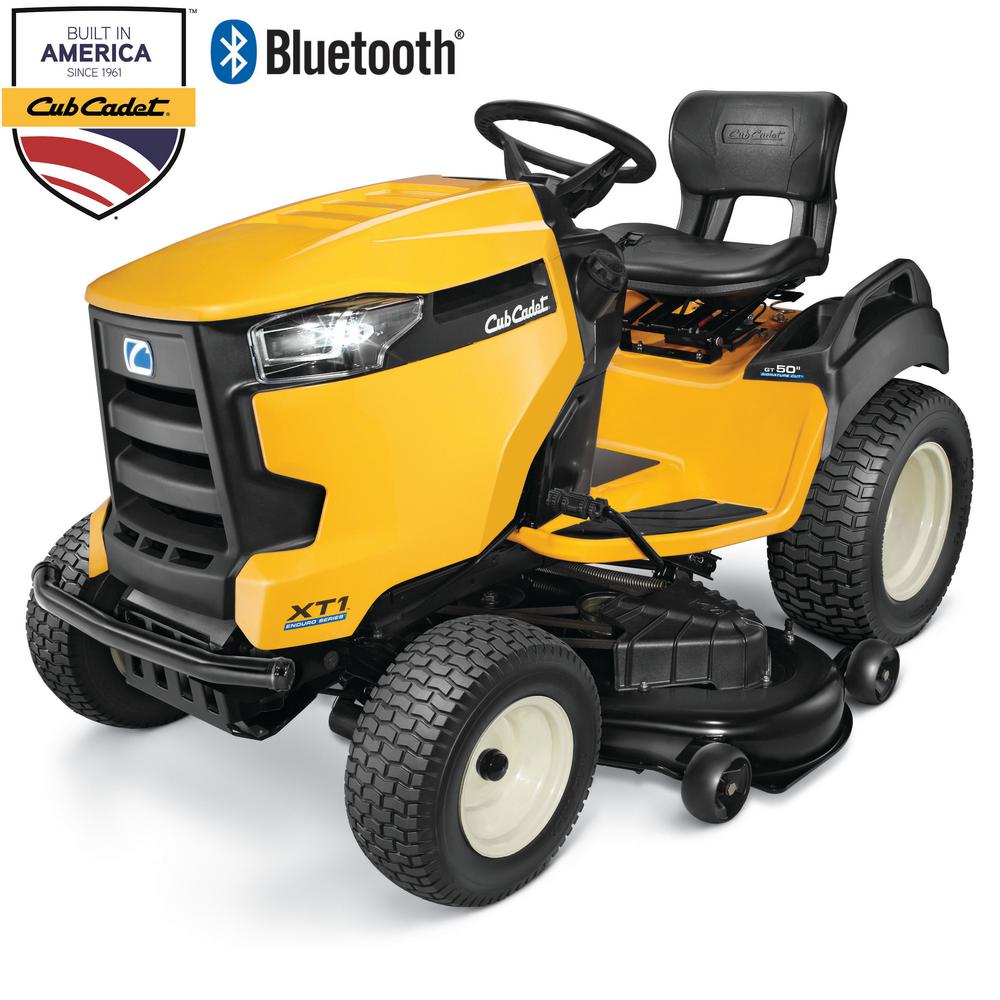 The Cub Cadet XT1 50 in. Riding Garden Tractor features category-leading strength, comfort and versatility. This riding mower is loaded with a 25 HP Kohler V-Twin OHV engine for powerful performance and a hydrostatic transmission drive for smooth and simple operation, eliminating the need for shifting-just push the pedal and go. The 50 in. 3-blade deck offers a 16 in. turning radius and electric PTO to engage the blades with just the push of a button. A sloped, 10 adjustable seat and soft comfort-grip steering wheel provide the ultimate in handling and comfort-and best of all, you can always be sure to operate at peak performance by connecting to your smartphone for maintenance reminders, hour tracking and more.